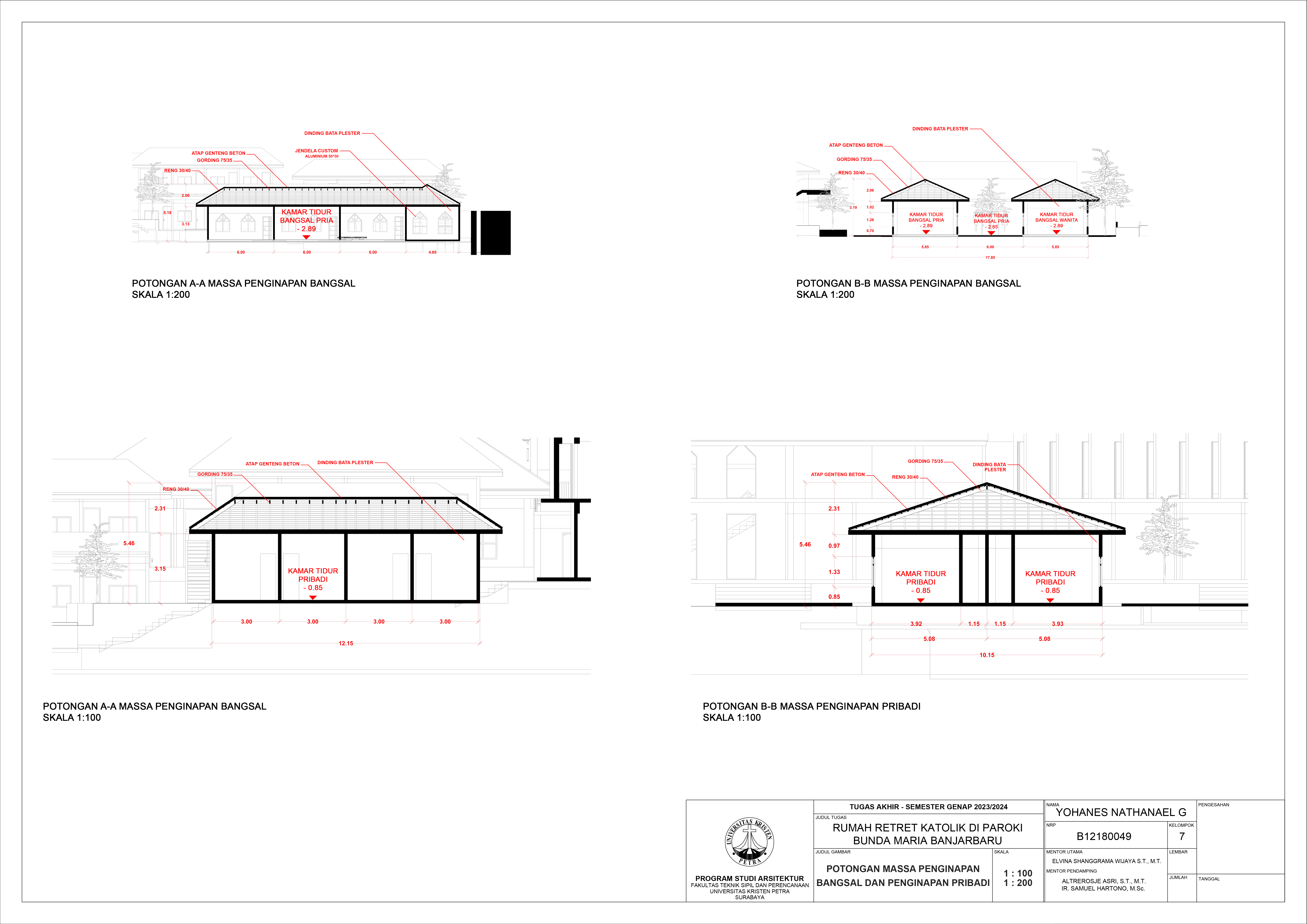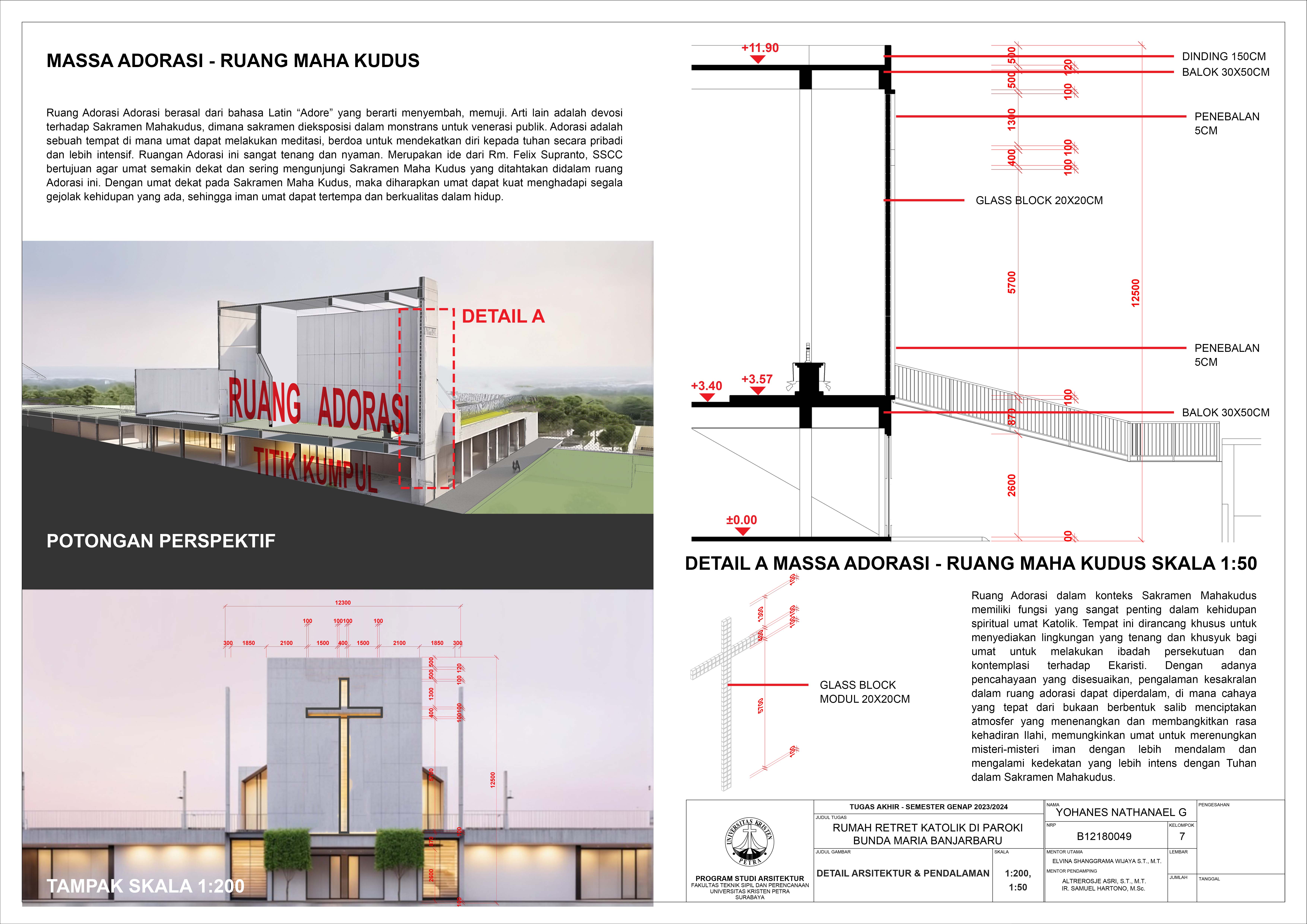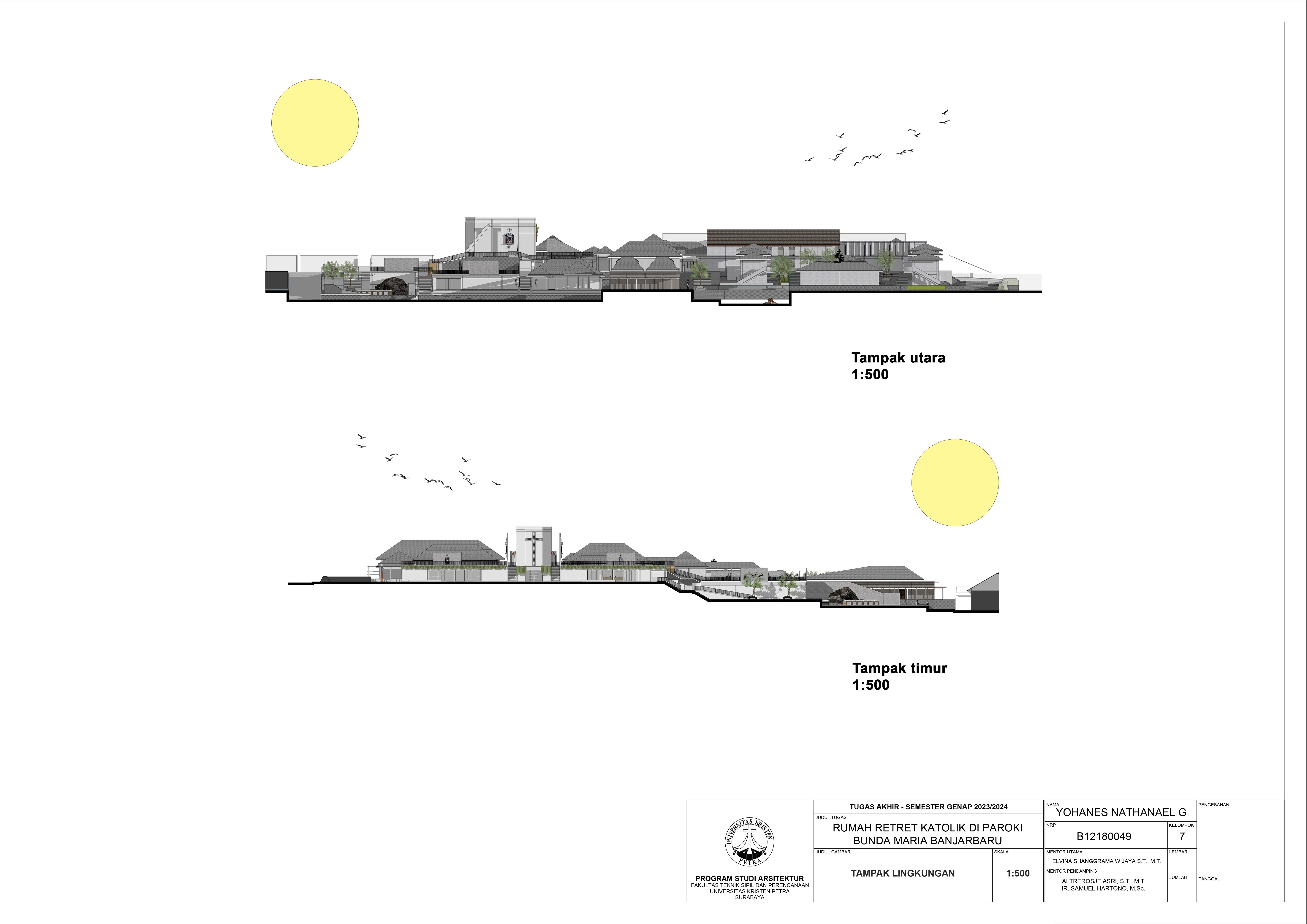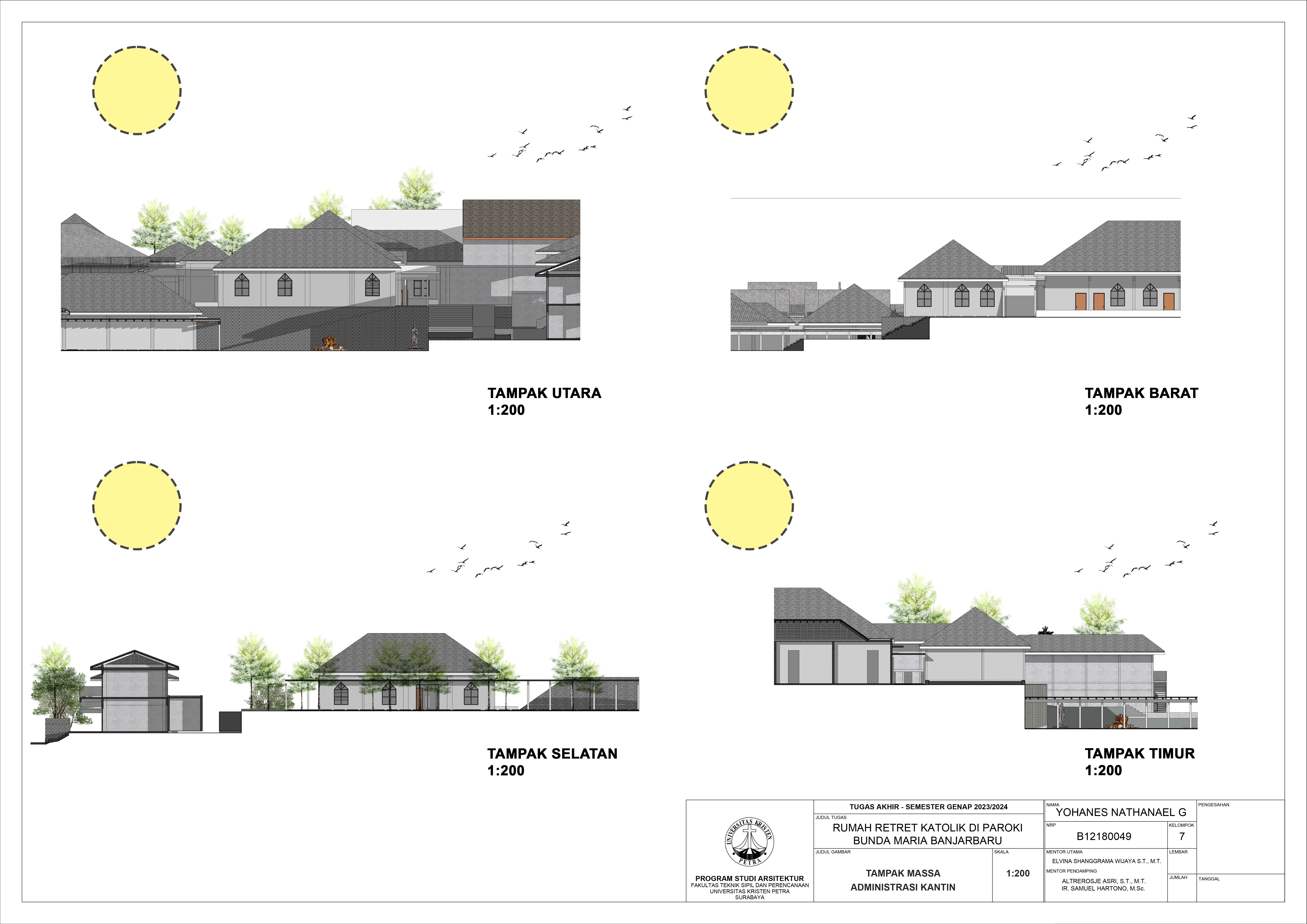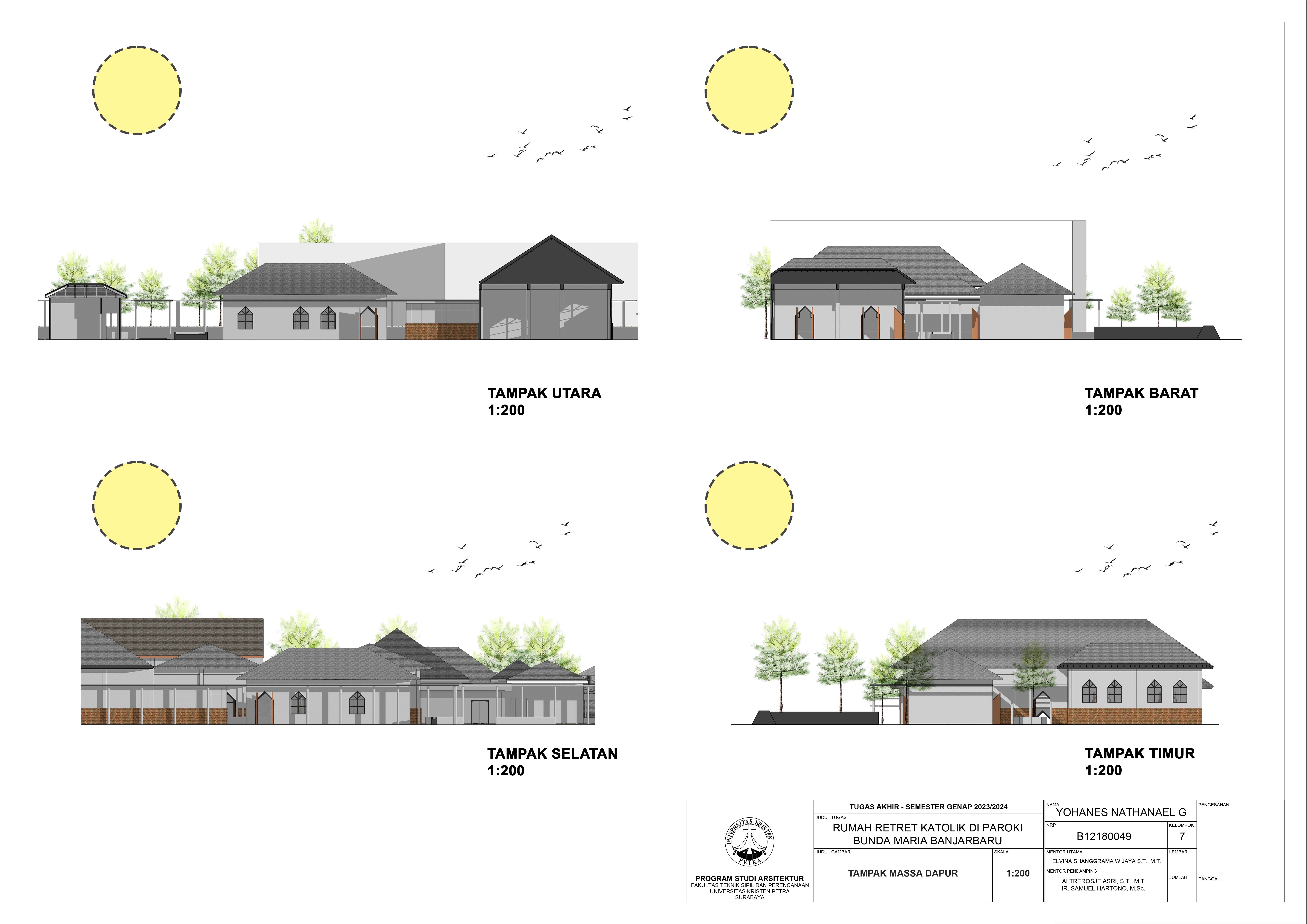 dan juga dihadapkan pada tantangan Ekonomi yang meningkat. Situasi ini menyoroti perlunya ruang-ruang suciuntuk memperdalam iman dan spiritualitas di tengah kesibukan dan tekanan kehidupan modern. Rumah RetretKatolik di Paroki Bunda Maria Banjarbaru adalah sebuah respons kebutuhan mendalam komunitas Katolik diKalimantan Selatan untuk memiliki tempat refleksi spiritual yang tenang dan mendalam. Perancangan RumahRetret ini menawarkan solusi dengan menyediakan fasilitas komprehensif termasuk kapel, ruang doa, aula, areahunian, ruang makan, serta fasilitas pendukung lainnya seperti toilet umum dan area parkir. Desainnyamengutamakan kesakralan dan kenyamanan personal dengan pendekatan holistik melalui penggunaan pencahayaan alami, lanskap yang terintegrasi, dan akustik yang mendukung. Penggunaan material yang dipilih dengan hati-hati dan penempatan strategis elemen religius juga memperkuat konsep desain yang mengutamakan kontemplasi dan interaksi spiritual. Inisiatif ini bertujuan untuk memperbarui dan memodernisasi fasilitas spiritual, yang ditunjukkan dengan transformasi dari Wisma Sikhar yang sudah tua menjadi Rumah Retret modern yang memenuhi kebutuhan spiritual saat ini sambil mempertahankan signifikansi historis dan spiritualnya.