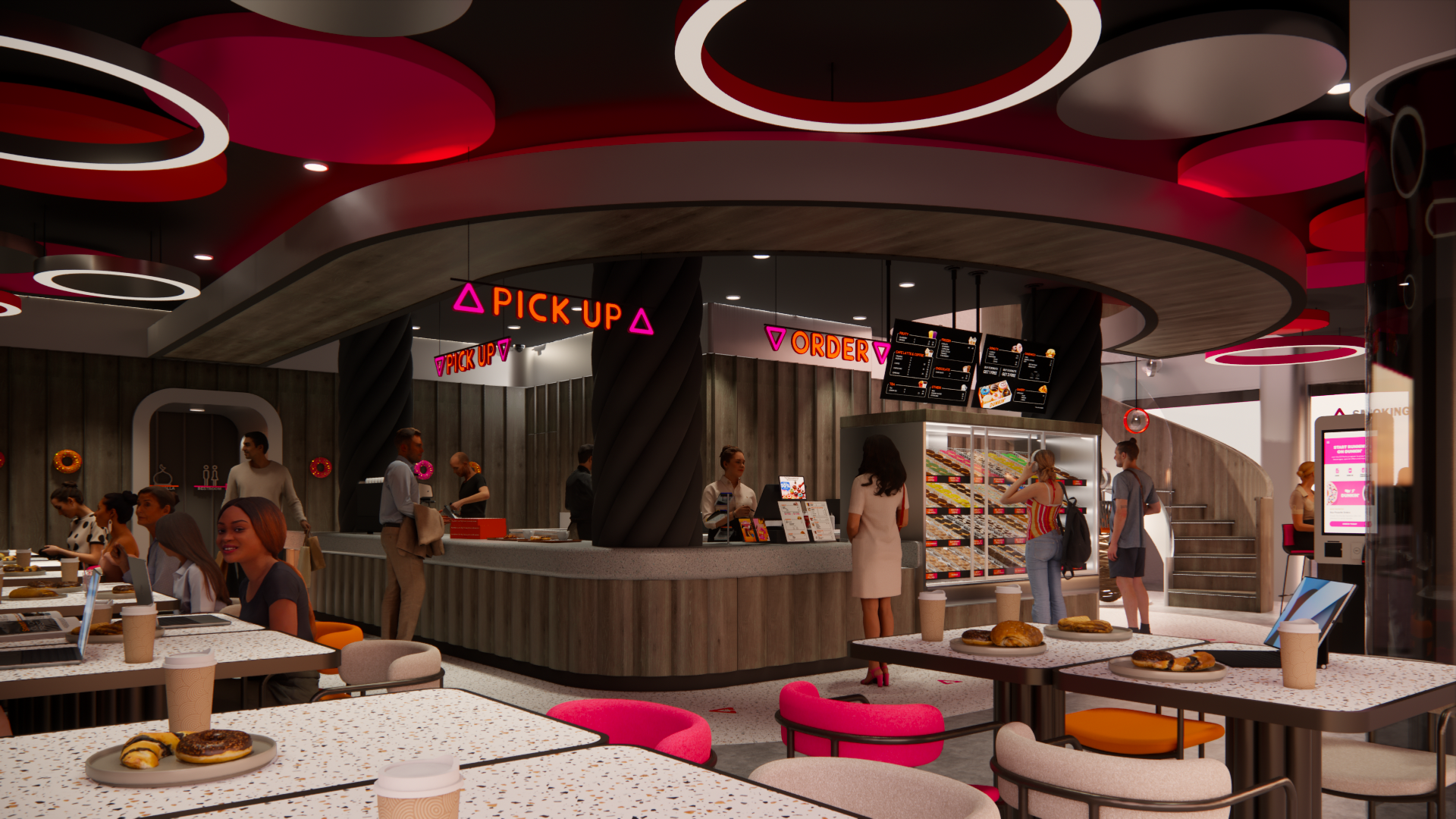 Umumnya, kafe adalah suatu tempat untuk makan dan minum sambil berkumpul, berbincang, bersantai, ataupun sekedar mengisi waktu luang. Namun seiring berkembangnya zaman, fungsi kafe berkembang menjadi tempat untuk bekerja. Mengingat sejak era pandemi, banyak orang harus menggunakan sistem kerja ‘work from home (WFH)’. Sistem tersebut berpengaruh pada kebiasaan dan pola kerja masyarakat, yang mana saat ini telah berkembang menjadi ‘work from café (WFC)’. Banyak orang yang merasa lebih nyaman dan produktif ketika bekerja di kafe. Sehingga kini kafe yang nyaman menjadi tempat yang banyak dicari orang. Maka dari itu, penulis mengangkat topik perancangan interior Dunkin’ Donuts dengan menggunakan pendekatan human-centered design (HCD), tujuannya untuk mendukung kenyamanan aktivitas pengguna. Perancangan ini menggunakan metode design thinking yang terdiri dari sembilan tahap, untuk menciptakan solusi yang menjawab permasalahan dan kebutuhan pengguna. Fokus perancangan ini mendukung kenyamanan pengguna dalam beraktivitas dengan menyesuaikan fungsi dan kebutuhan ruang berdasarkan penggunanya. Tujuan perancangan ini untuk meningkatkan minat pengunjung dan mendukung produktivitas seluruh pengguna baik pengunjung maupun staf. Perancangan ini menghasilkan desain kafe yang fokus pada kebutuhan dan pola aktivitas pengguna, guna memaksimalkan produktivitas, kualitas layanan, minat dan tingkat kepuasan pengunjung, dan brand awareness suatu kafe.