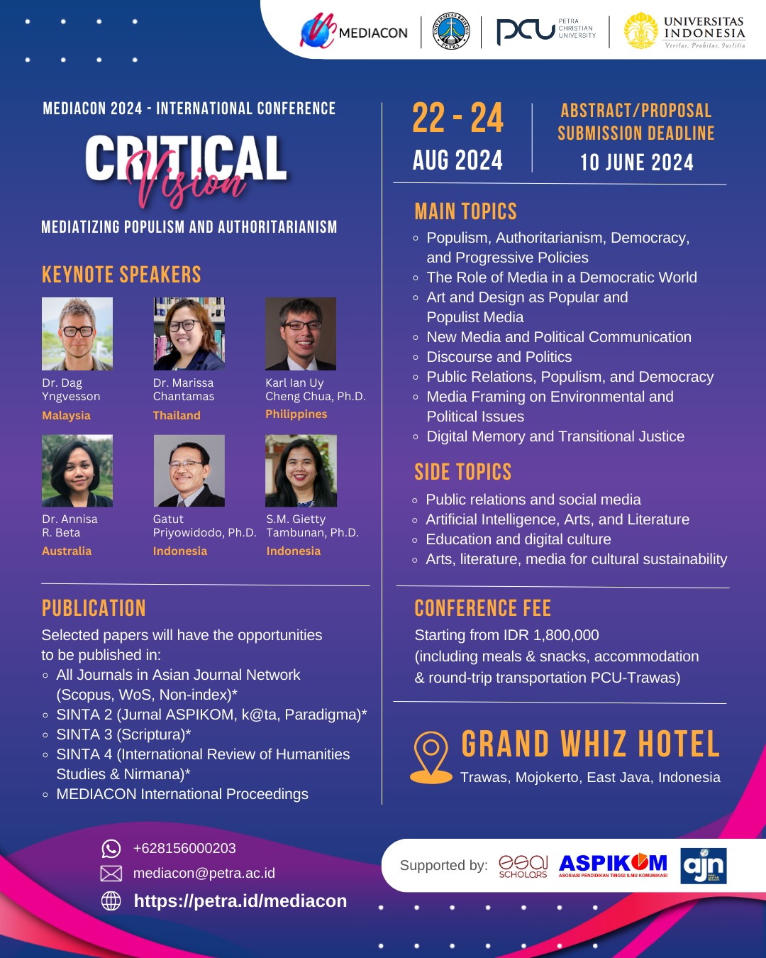 Fakultas Humaniora dan Industri Kreatif Universitas Kristen Petra Surabaya pada tanggal 22-24 Agustus 2024 Menyelenggarakan acara Mediacon 2024 - international conference: critical vision. Acara ini diselenggarakan di Grand Whiz Hotel Trawas Mojokerto.