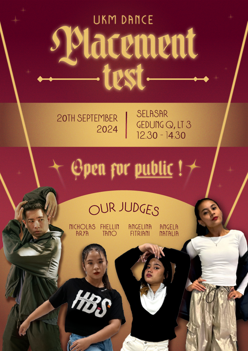 Placement Test adalah kegiatan UKM Dance untuk melihat dimana peserta UKM Dance akan ditempatkan di kelas-kelas yang ada. Kegiatan ini bersifat terbuka dan bisa ditonton oleh seluruh PETRANESIAN. Acara ini digelar pada 20 September 2024 di Selasar gedung Q lantai 3.