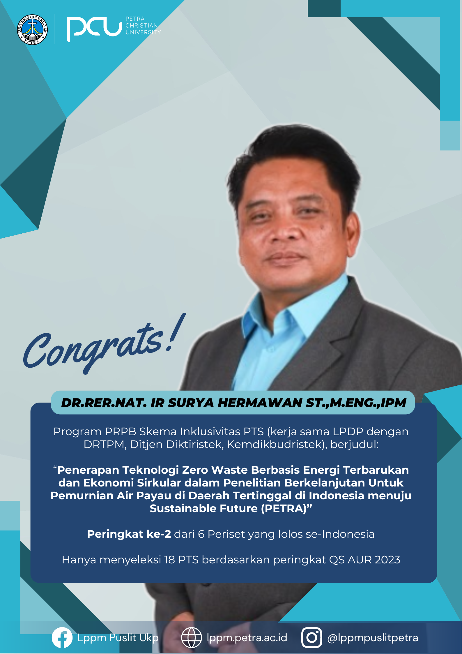 Ucapan selamat diberikan kepada Penerima Program PRPB dari LPDP dan DIKTI tahun anggaran 2024. Pada tahun 2024 penerima dari Universitas Kristen Petra Surabaya adalah Dr.Rer.Nat. Ir. Surya Hermawan, S.T., M.Eng., IPM.