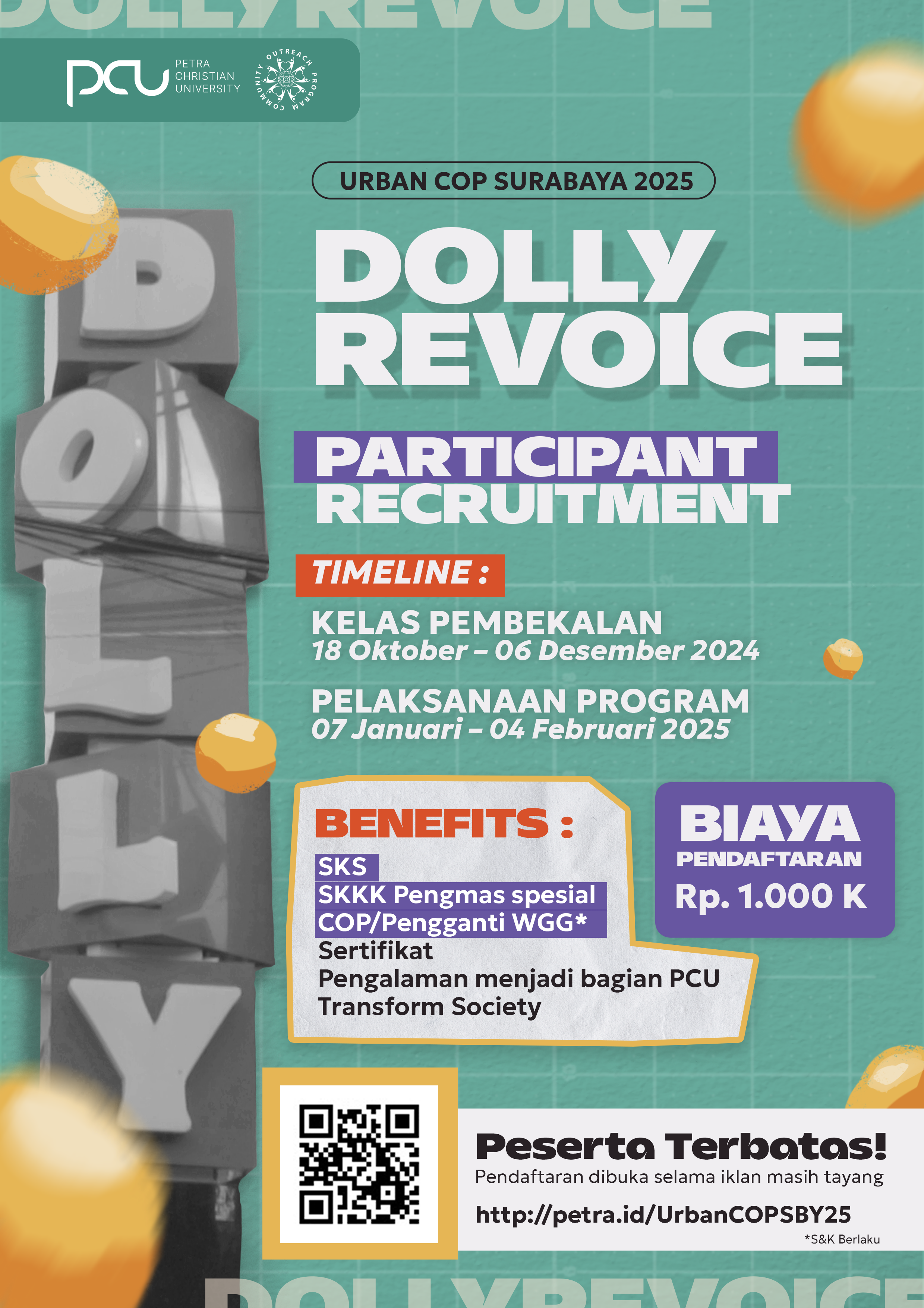 COP Kota Surabaya 2025 hadir kembali. Dengan mengusung tema "Dolly Revoice", kami kembali mengundang mahasiswa-mahasiswi aktif PCU untuk berpartisipasi dalam mendukung transformasi masyarakat di Kampung Dolly. Pendaftaran peserta ditutup pada tanggal 17 Oktober 2024.