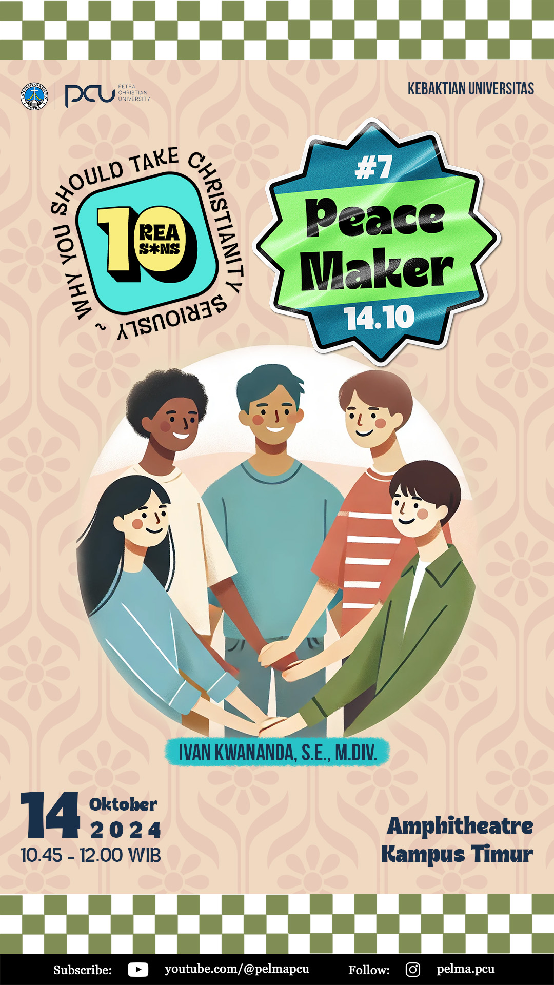 Peperangan (bangsa melawan bangsa) menjadi fenomenon yang nyata belakangan ini. Bahkan, sebenarnya peperangan tidak pernah vacum. Selalu ada peperangan, baik yang terekspose ataupun tidak; baik yang global mau lokal. Isu menjadi pendamai bukan lagi menjadi tema kekristenan secara eksklusif. Berbagai pandangan mencoba memberikan tawaran dan jawaban. Pertanyaannya, apa yang menjadi keunikan pembawa damai yang ditawarkan dalam kekristenan (Injil)? Apa yang membedakan dengan berbagai macam pandangan yang ada? Apa yang unik dalam ajaran Injil Yesus Kristus? Itulah topik dari Kebaktian universitas yang diadakan pada Senin, 14 Oktober 2024 bertempat di Amphitheater Gedung Q, dengan Pengkhotbah Ivan Kwananda, S.E., M.Div.
