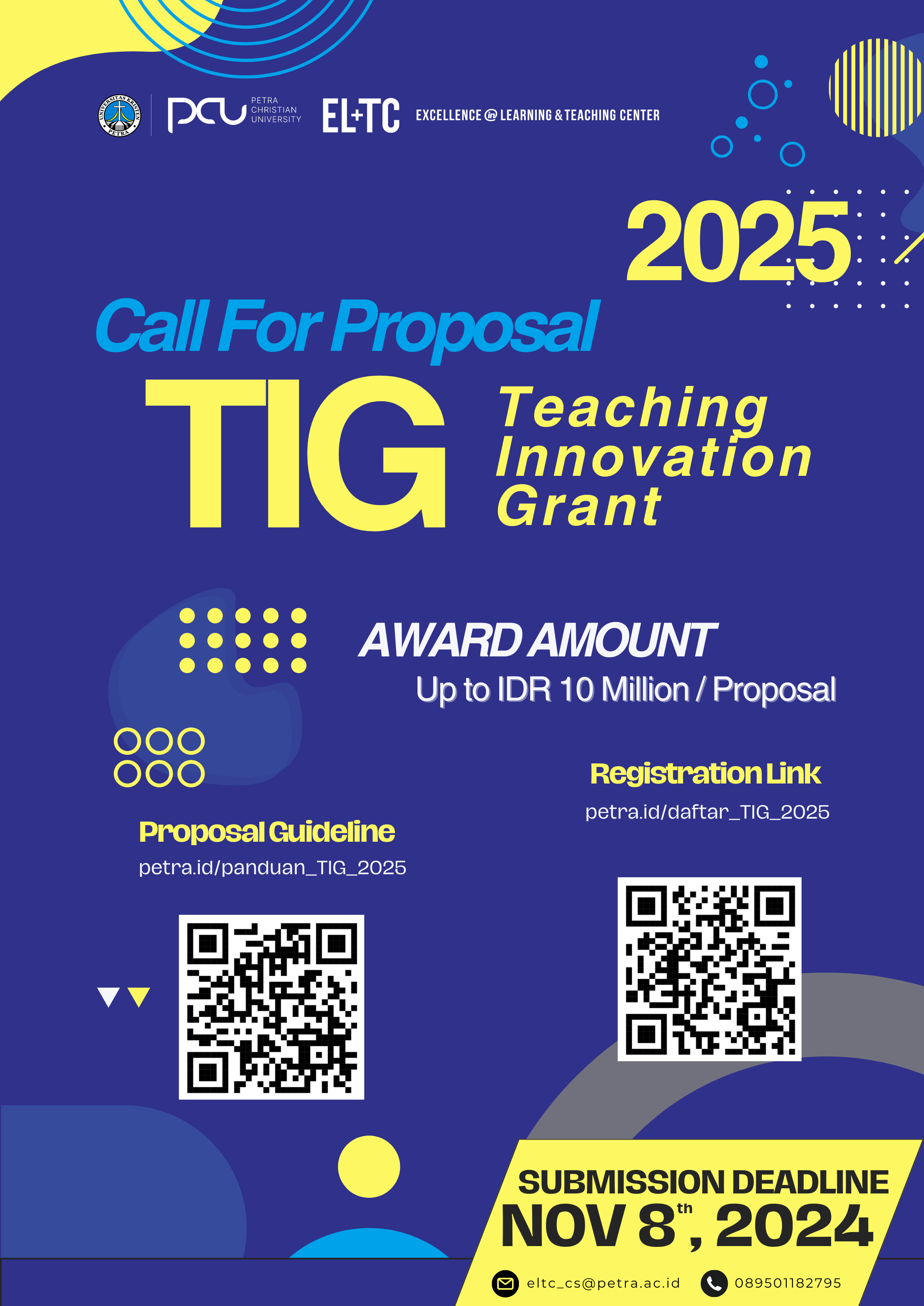 Call for Proposal Teaching Innovation Grant (TIG) 2025, dibuka oleh panitia. Deadline penerimaan proposal ditutup pada 08 November 2024.