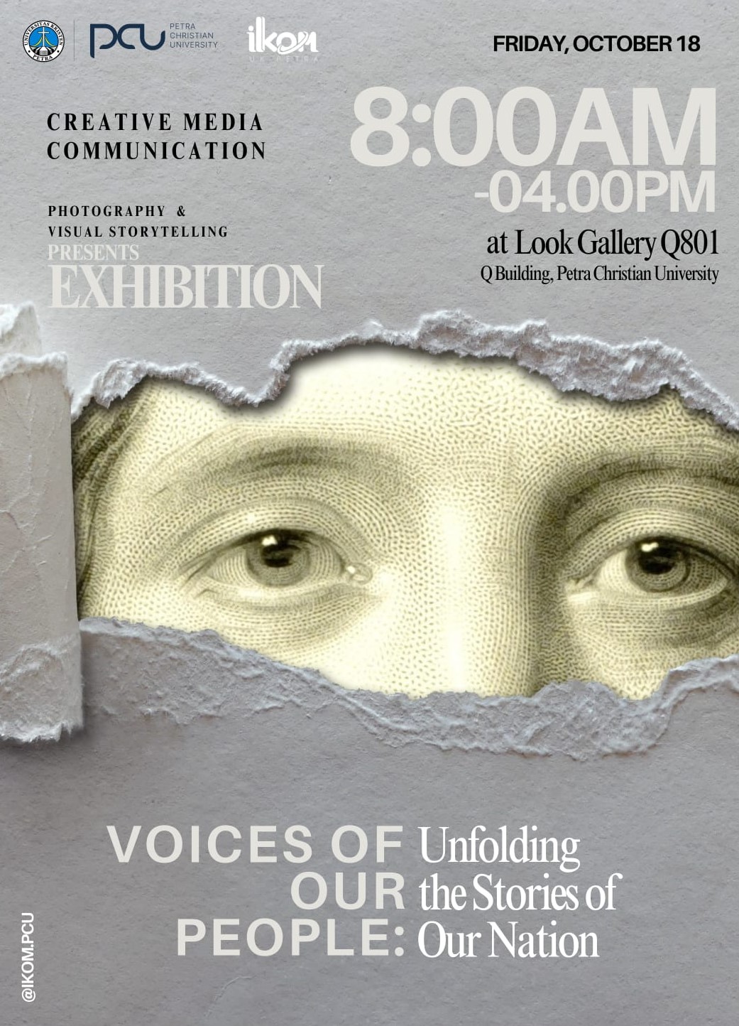 Pameran Fotografi & Visual Storytelling " Voice Of Our People : Unfolding the stories of our Nation." Diakan oleh Program Studi Ilmu Komunikasi UK Petra pada tanggal 18 Oktober 2024 bertempat di Gedung Q.801.
