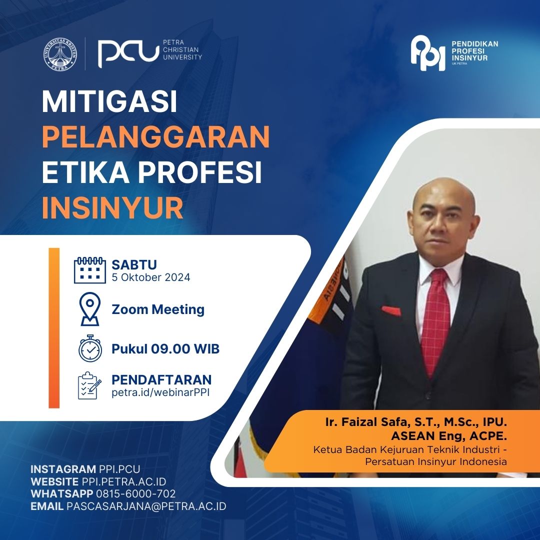 Guest Lecture SeriesTopik: "Mitigasi Pelanggaran Etika Profesi Insinyur" diselenggarakan oleh Program Pendidikan Profesi Insinyur Universitas Kristen Petra Surabaya pada Sabtu, 5 Oktober 2024 jam 09.00 WIB dengan narasumber Ir. Faizal Safa, S.T., M.Sc., IPU. ASEAN Eng, ACPE.Ketua Badan Kejuruan Teknik Industri - Persatuan Insinyur Indonesia. Kegiatan ini dilaksanakann sevcara online melaluli Zoom Meeting.