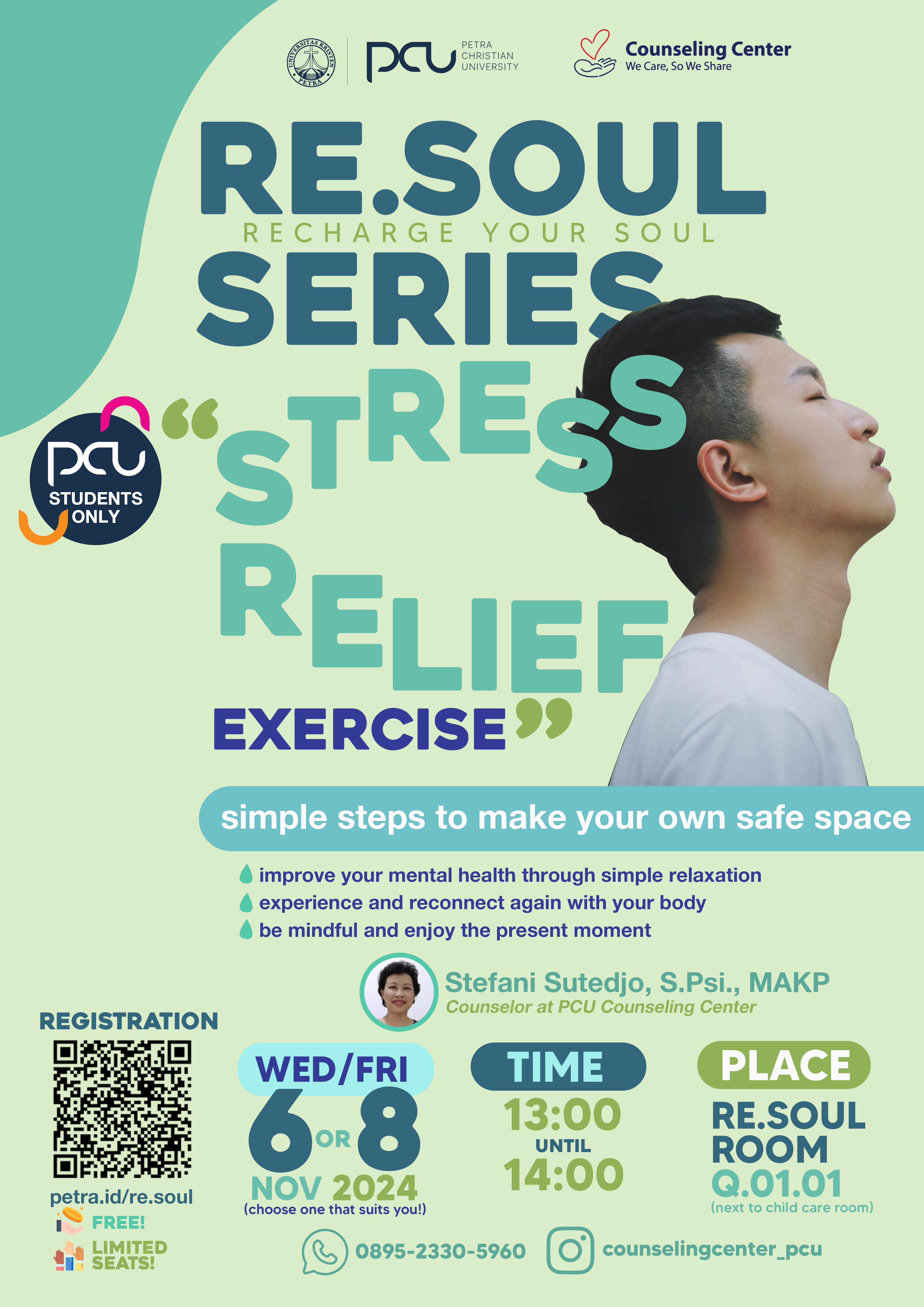 Sebuah lokakarya praktis terkait pertolongan diri yang menolong mahasiswa memahami teknik relaksasi dan pelepasan stres. Lokakarya ini diselenggarakan pada 06 dan 08 November 2024 jam 13.00 -14.00 WIB tempat gedung Q.01.01. dengan narasumber Stefani Sutedjo, S.Psi., MAKP.