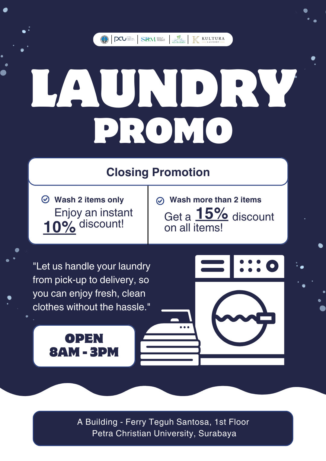Wash 2 items and enjoy an instant 10% discount! Wash more than 2 items and save 15% on all items! Promo Period: November 28 – December 5 Opening Hours: 8 AM – 3 PM Location: Ferry Teguh Santosa Building, 1st Floor, Petra Christian University, Surabaya. Pick-up and delivery services are available for your convenience!Don't miss this chance to enjoy hassle-free laundry at unbeatable prices. Let us handle your laundry while you focus on what matters most!