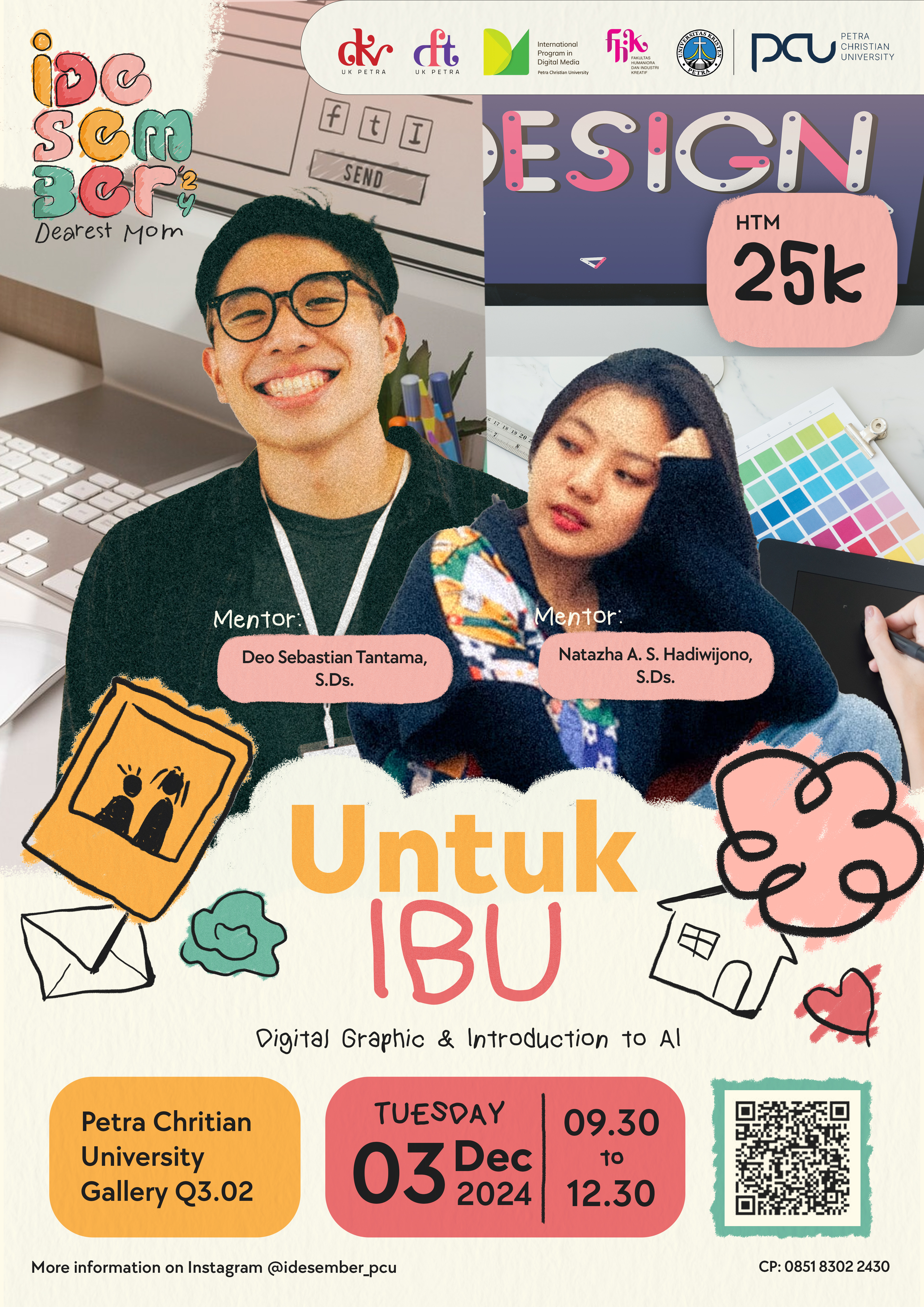 Program Studi Desain Interior Universitas Kristen Petra Surabaya pada tanggal 03 Desember 2024 jam 09.30 - 12.30 WIB mengadakan workshop tentang Digital graphic and introduction to AI: untuk ibu. Dengan narasumber Deo Sebastian Tamtama, S.Ds. dan Natazha A.S. Hadiwijono, S.Ds.