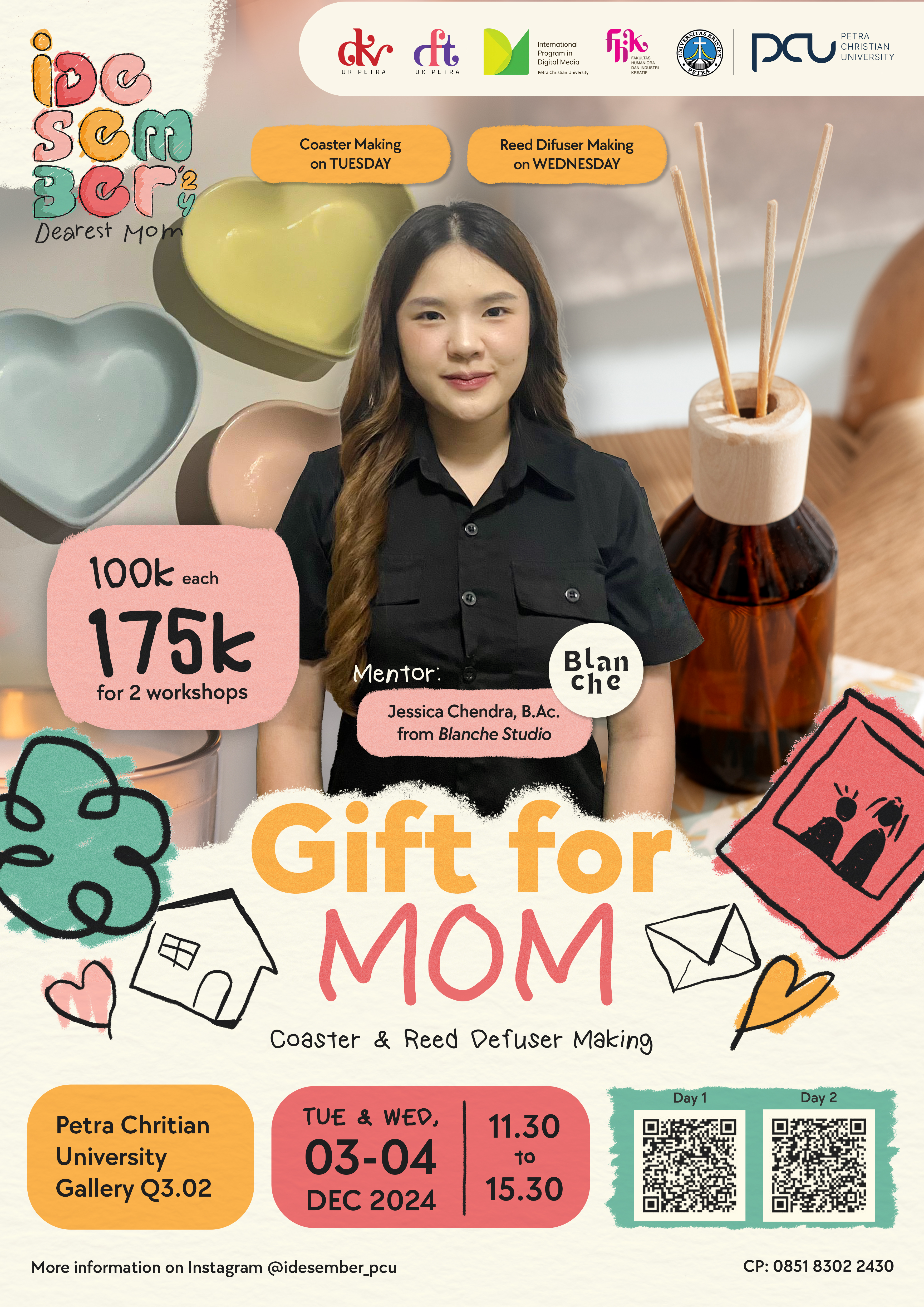 Program Studi Desain Interior Universitas Kristen Petra Surabaya pada tanggal 03 - 04 Desember 2024 jam 11.30 - 15.30 WIB mengadakan workshop tentang Coaster and reed defuser making: gift for mom. Dengan narasumber Jessica Chendra, B.Ac