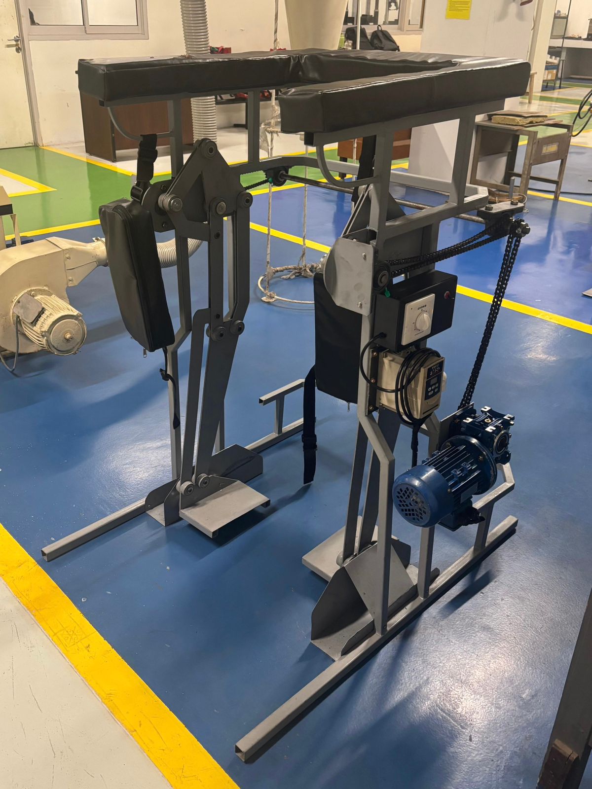 Tongkat adalah alat dukung untuk menjaga stabilitas atau keseimbangan saat berjalan. Tongkat ini digunakan oleh mereka yang memiliki disabilitas mobilitas atau gangguan keseimbangan ringan. Alat bantu yang sering digunakan oleh mereka yang sedang dalam masa rehabilitasi dari cedera kaki atau punggung adalah tongkat letter U. Terkadang pada pasca rehabilitasi seseorang tidak dapat menggunakan tongkat. Maka dari itu, penelitian ini bertujuan untuk membuat dan merancang alat bantu rehabilitasi yang mampu mengangkat dan menggerakkan kaki pasien seperti simulasi berjalan. Alat bantu rehabilitasi ini memiliki beberapa poros putar yaitu 2 yang memiliki gerak CW (clockwise) dan CCW (counterclockwise). Pembuatan alat itu sendiri dilengkapi beberapa alat bantu safety seperti baby seat dan softtouch sebagai pengaman dan alat bantu kenyamanan selama proses. Kecepatan alat bantu akan dibuat untuk meningkat secara bertahap dari 0,1 m/s sampai dengan 0,5 m/s dengan tahap peningkatan kecepatan 0,1 m/s. Dari hasil penelitian, alat bantu yang dirancang memiliki kapasitas berat yaitu maksimal 80 kg dengan menggunakan bantuan worm gearbox perbadingan 1:80. Pada proses pengujian alat dapat berfungsi dengan mengangkat seseorang yang memiliki berat dengan range 40 kg sampai 70 kg dengan menguji kecepatan pada setiap orang yang menaik alat bantu. Pengujian pada setiap berat bertujuan untuk melakukan kalibrasi yang sesuai dengan kecepatan yang diingikan yaitu 0,1 m/s sampai 0,8 m/s