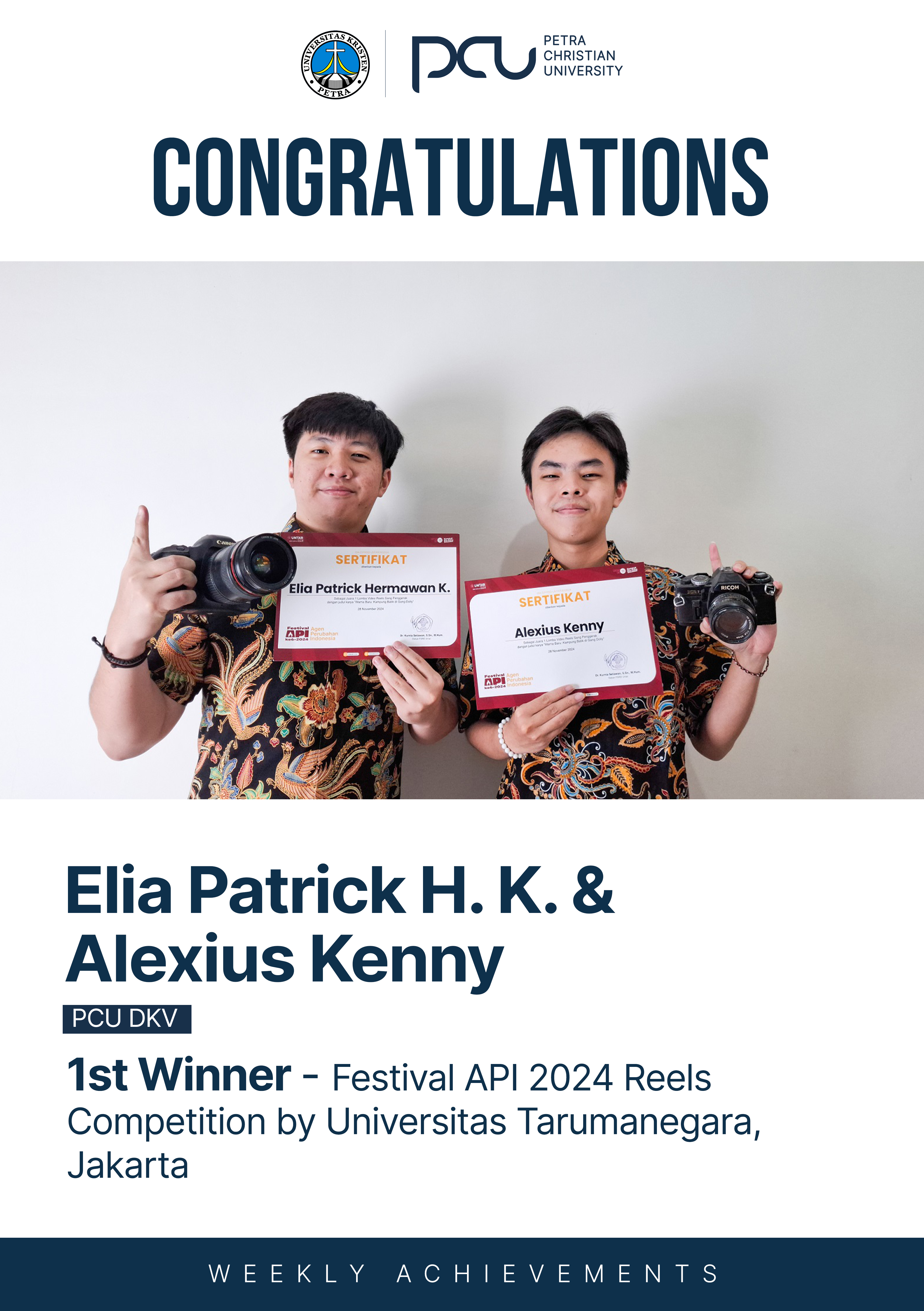 Selamat atas prestasi yang diraih oleh Elia Patrick H. K., Alexius Kenny dalam Festival API 2024 Reels Competition by Universitas Tarumanegara Jakarta