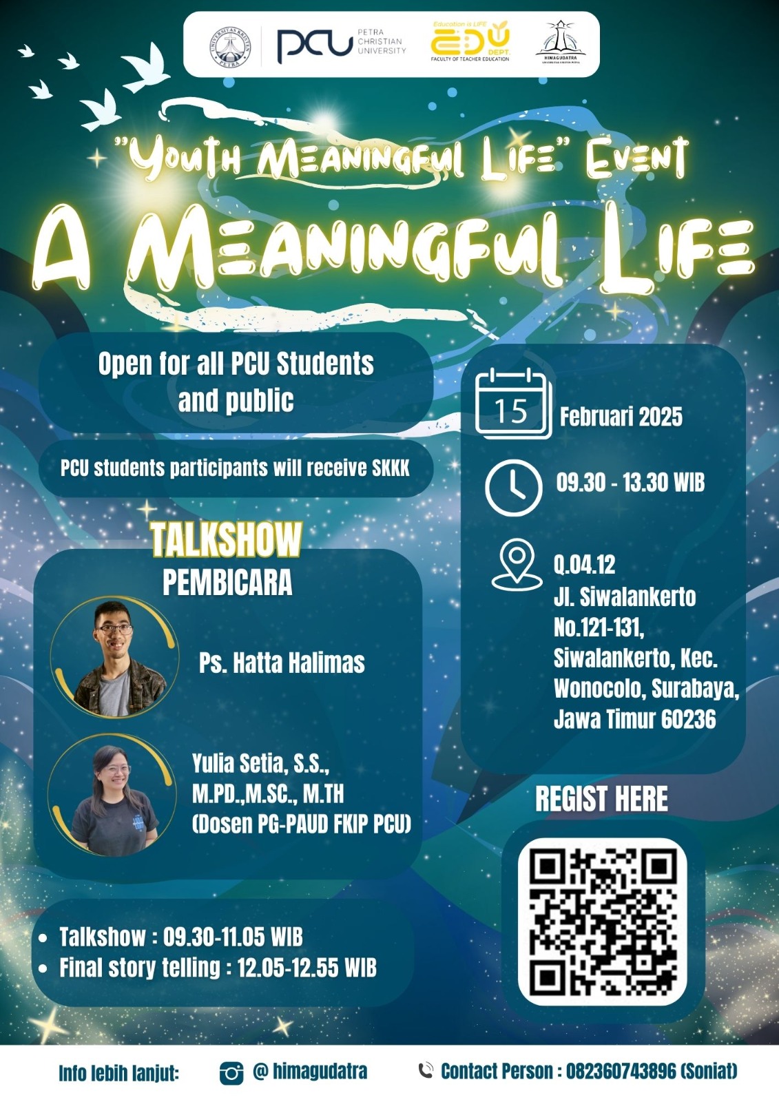 Mari ikuti Youth Meaningful Life Event 2025, sebuah acara inspiratif yang akan membuka wawasan dan membantu kamu menemukan cara hidup yang lebih penuh arti!💡 Dalam acara ini, kamu akan mendapatkan kesempatan untuk berkembang dan memperdalam pemahaman tentang kehidupan yang lebih berdampak di masa yang akan datang, baik untuk diri sendiri maupun orang lain!