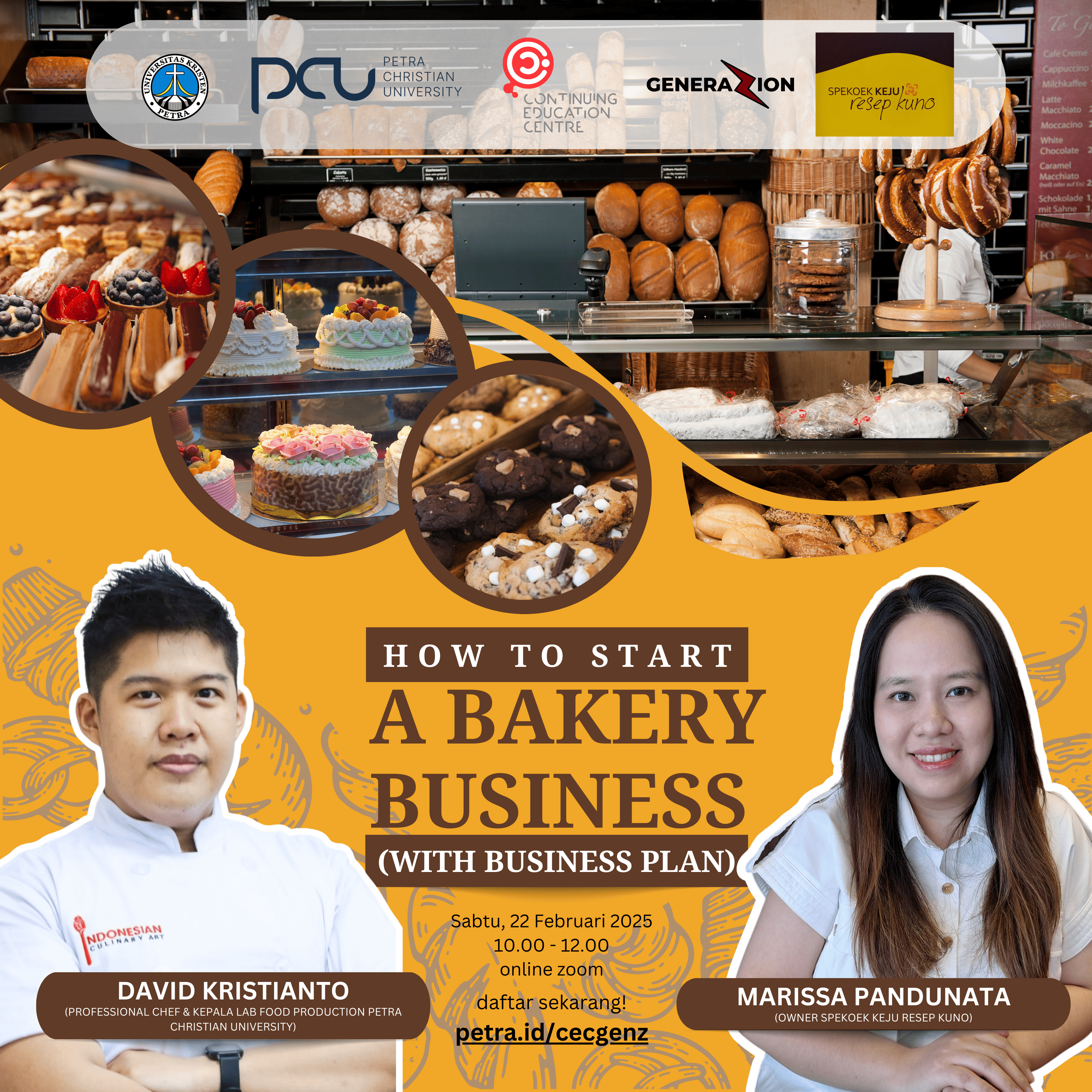 Workshop tentang bisnis roti akan diselenggarakan oleh Program Pendidikan Berkelanjutan pada Sabtu 22 Februari 2025 jam 10.00 - 12.00 WIB. Dengan narasumber David Kristianto dan Marissa Pandunata. Acara ini diselenggarakan secara online melalui Zoom Online.