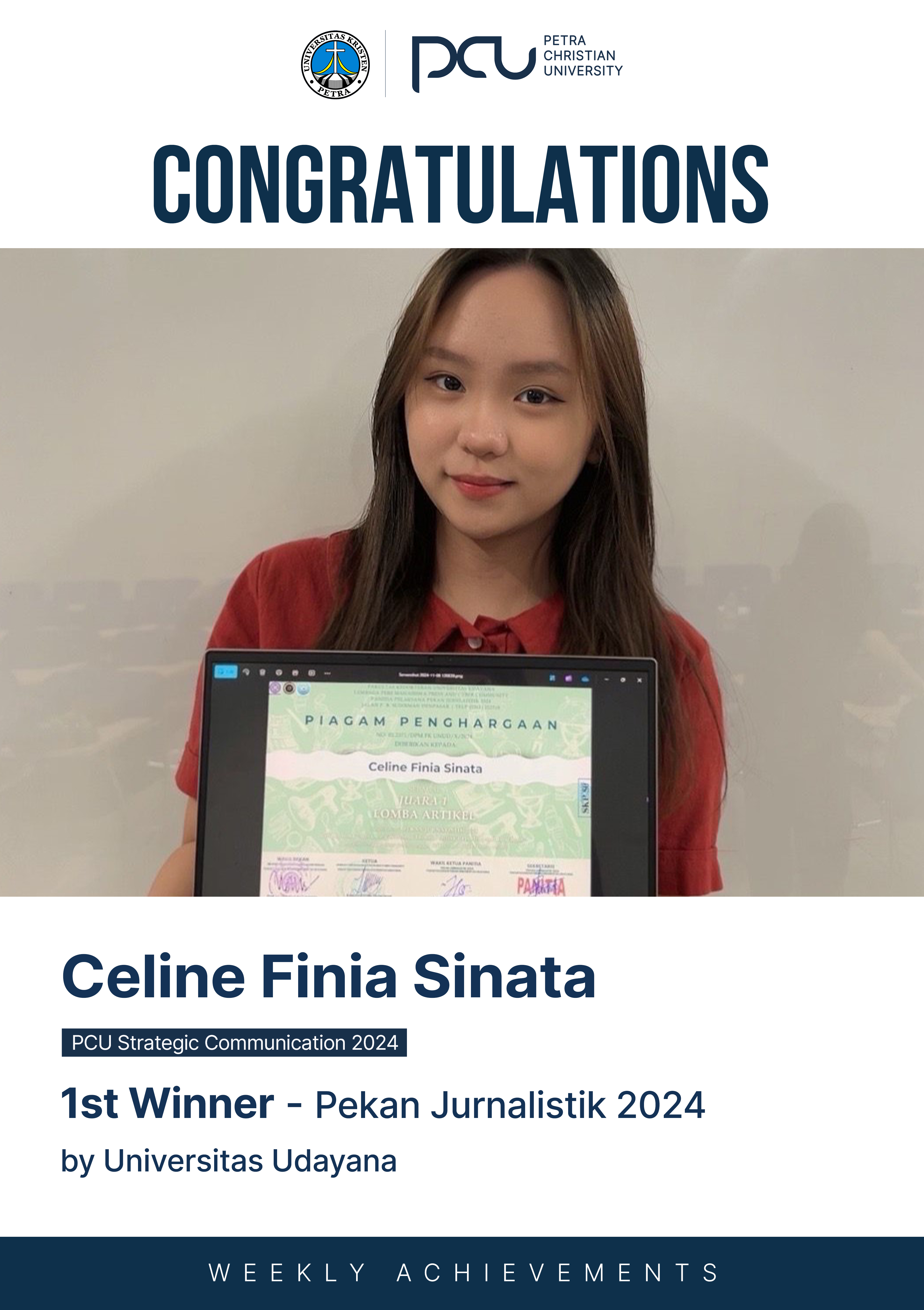 Selamat atas prestasi yang diraih oleh Celine Finia Sinata sebagai 1st Winner dalam Pekan Jurnalistik2024 by Universitas Udayana