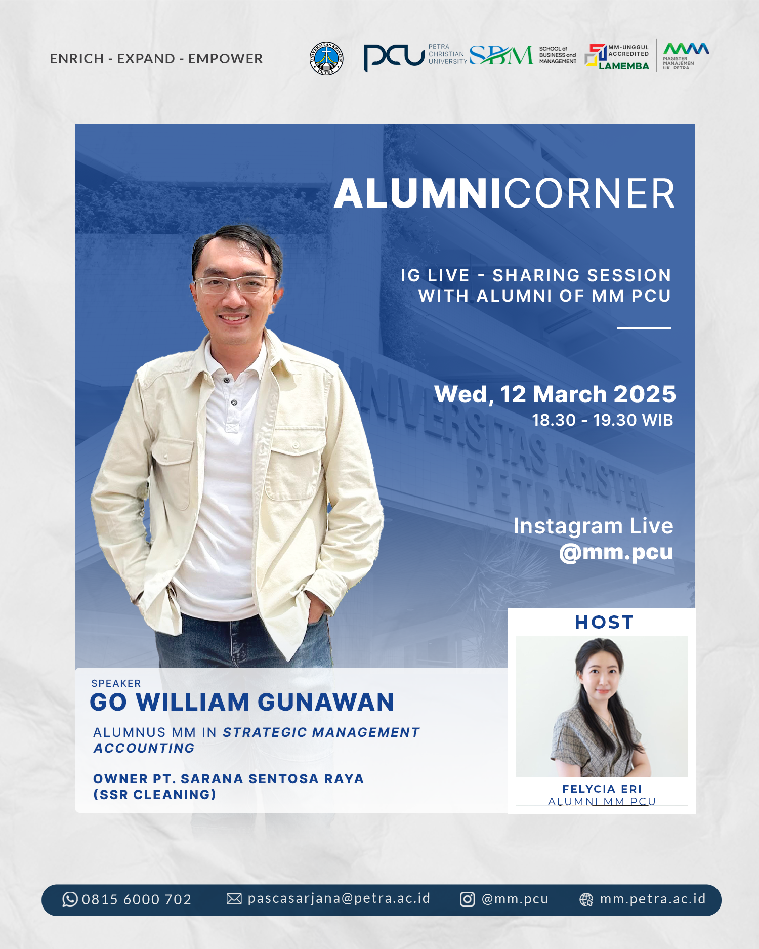 Pada Rabu, 12 Maret 2025, Program Studi Magister Manajemen UK Petra mengadakan acara alumni corner. Dalam acara ini akan menghadirkan Go William Gunawan sebagai narasumber yang juga alumni dari magister manajemen UK Petra.