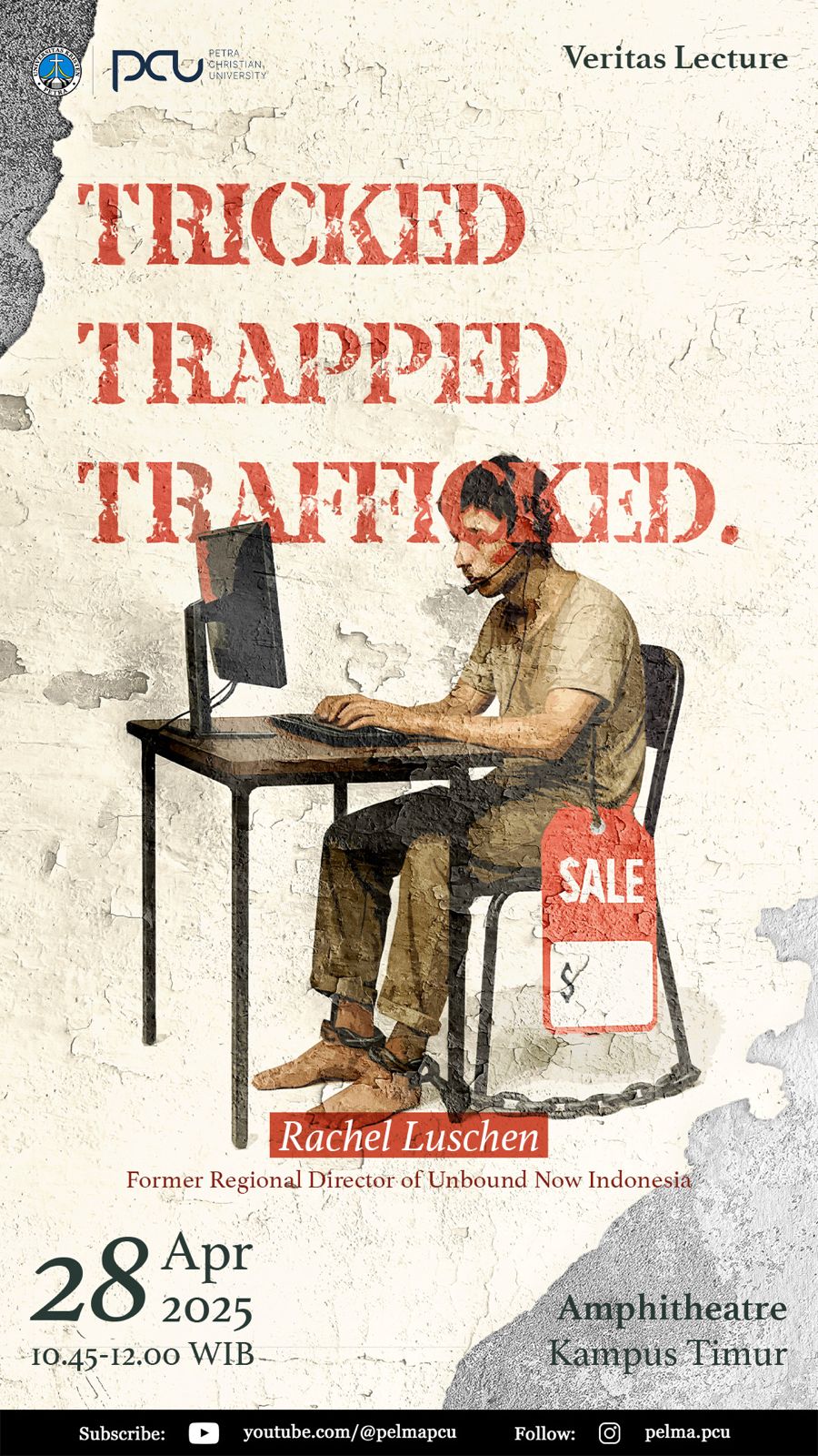 Kebaktian universitas kembali diadakan pada Senin 28 April 2025 dengan format veritas lecture. Dengan mengangkat tema tricked, trapped, trafficked bersama narasumber Rachel Luschen. Bertempat di Amphitheatre gedung Q. jam 10.45-12.00 WIB.