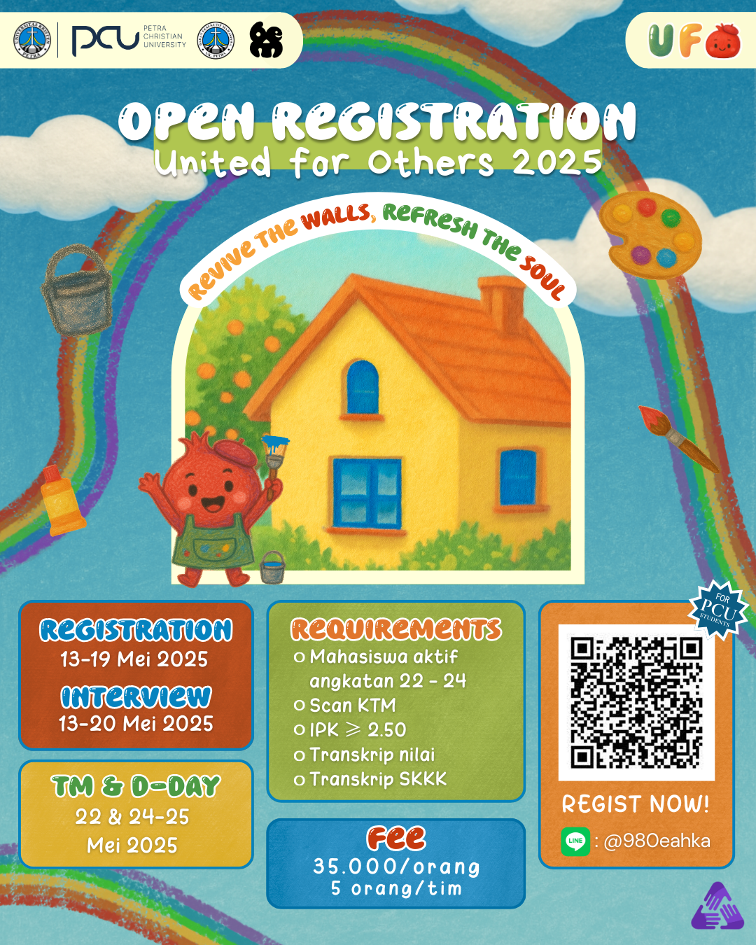 Badan Eksekutif Mahasiswa UK Petra mengajak para mahasiswa UK Petra untuk ikut ambil bagian dalam acara United For Others 2025. United For Others adalah kegiatan pengabdian masyarakat yang tahun ini berfokus pada pengecatan ruang kelas. Rangkaian acara kegiatan ini adalah Techinical Meeting dan D-Day yang akan diselenggarakan dalam 2 hari. Pendaftaran dibuka pada tanggal 13-19 Mei 2025.