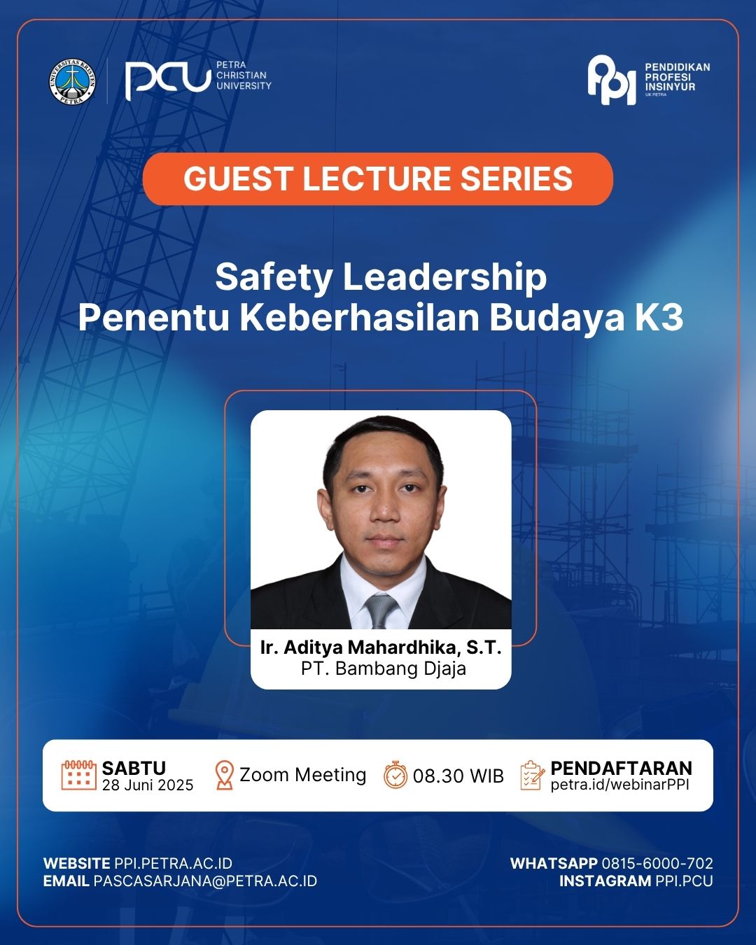 🚧 GUEST LECTURE SERIES - PPI PCU🚧📣 Yuk ikuti kuliah tamu dengan topik:"Safety Leadership: Penentu Keberhasilan Budaya K3"bersama:👨🏫 Ir. Aditya Mahardhika, S.T.(PT. Bambang Djaja)📅 Sabtu, 28 Juni 2025🕣 08.30 WIB📍 Zoom Meeting📝 Daftar sekarang di: petra.id/webinarPPI🎯 Cocok untuk kamu yang ingin mendalami peran kepemimpinan dalam menciptakan budaya keselamatan kerja yang kuat dan berkelanjutan!#SafetyLeadership #BudayaK3 #KuliahTamu #PendidikanProfesiInsinyur #PPIUKPetra #PCU #PetraChristianUniversity #PetraNesian #InsinyurIndonesia #EngineerLeadership #WebinarPPI