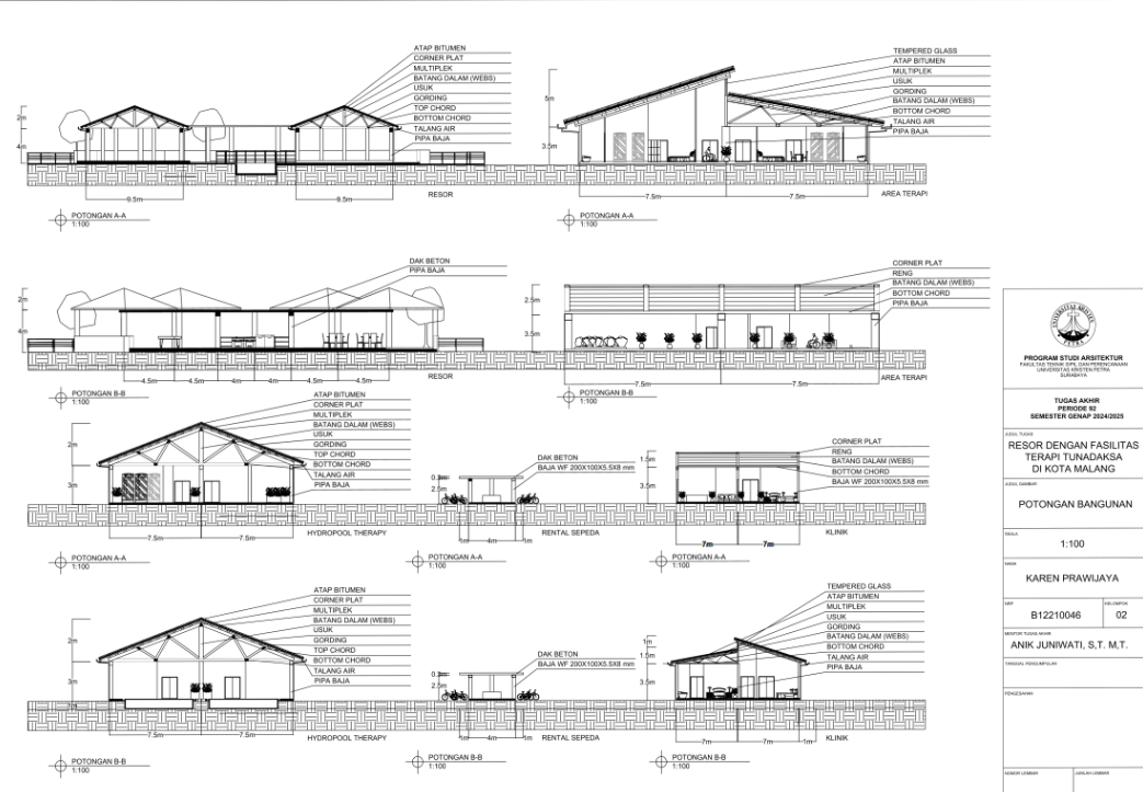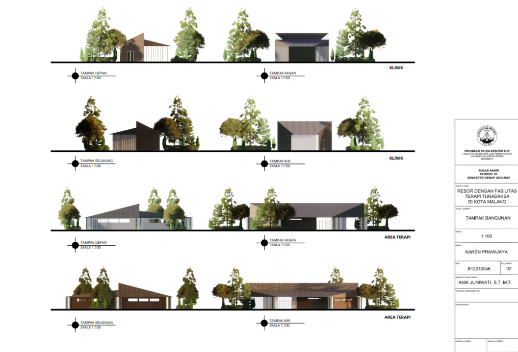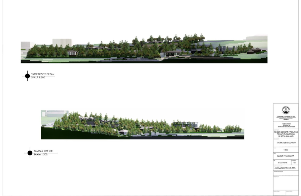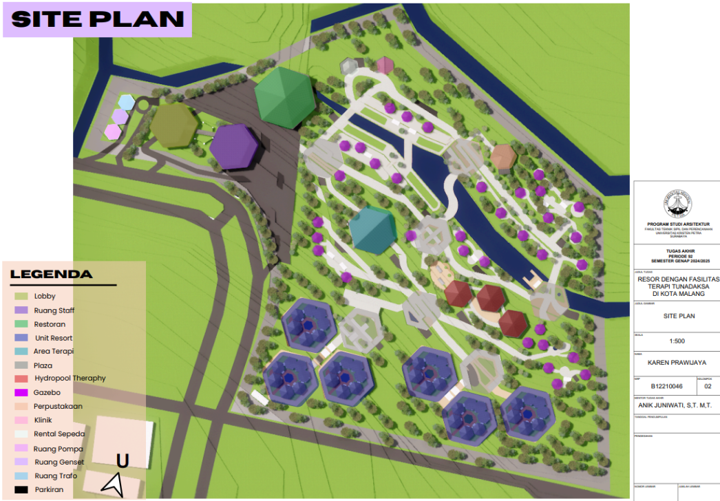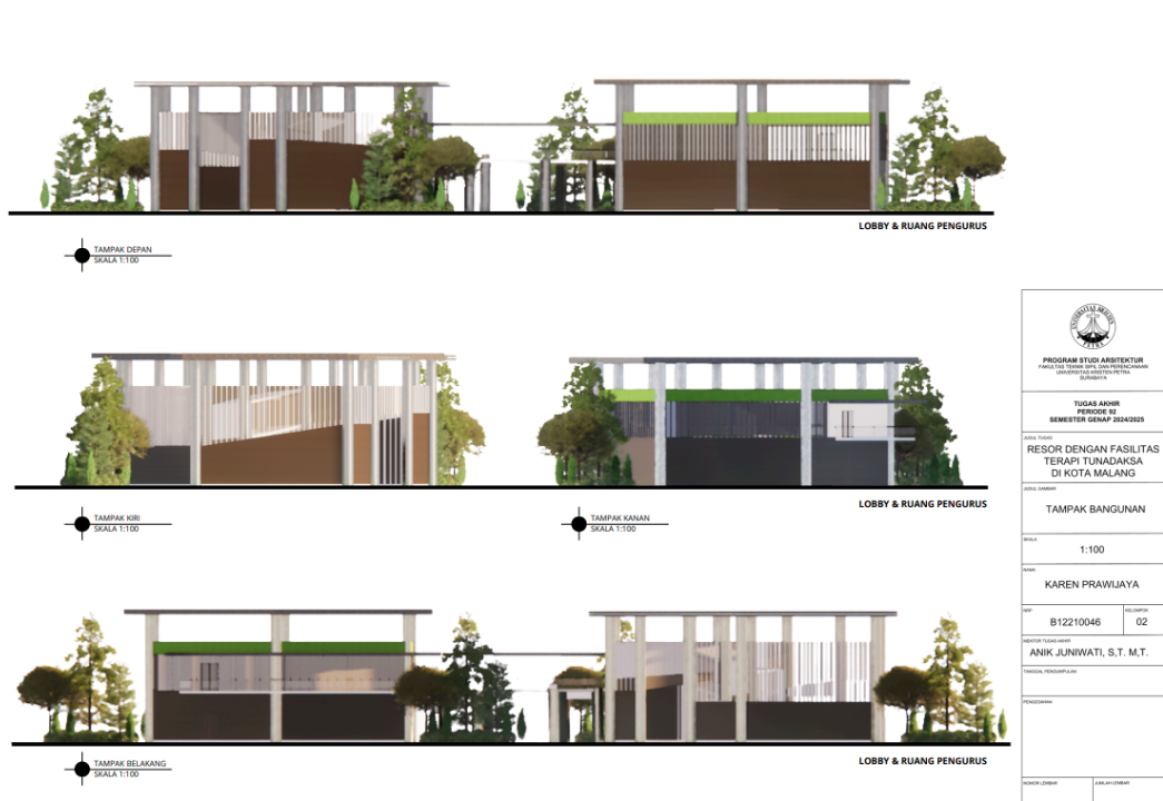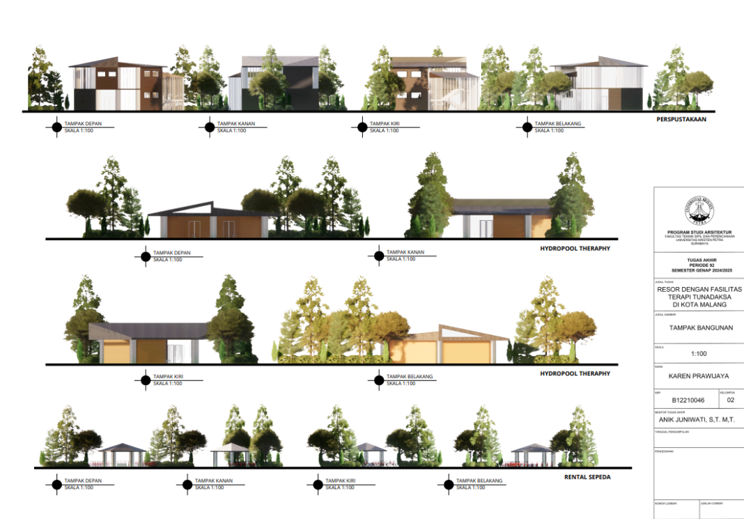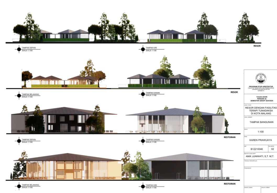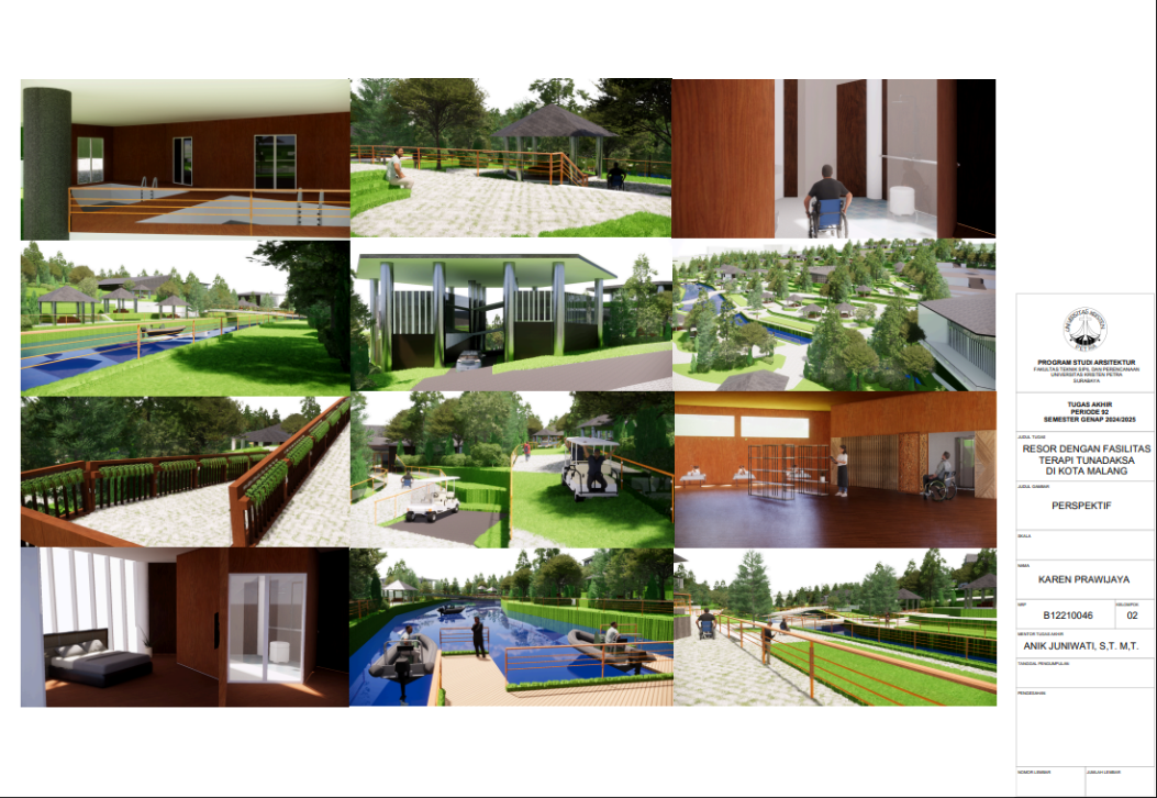 Kota Malang memiliki visi sebagai "Health City" yang mendorong tersedianya fasilitas pendukung kesehatan bagi seluruh kalangan, termasuk penyandang disabilitas. Namun, ketersediaan fasilitas wisata yang universal bagi tunadaksa masih sangat terbatas. Sehingga Resort dengan Fasilitas Terapi Tunadaksa dirancang sebagai tanggapan terhadap meningkatnya jumlah disabilitas, di sisi lain semua orang tanpa terkecuali memerlukan refreshing Konsep utama yang diangkat adalah Equitable Experience, yang artinya semua orang dapat mendapat pengalaman yang sama tanpa terkecuali. Salah satunya diwujudkan melalui perpaduan massa bangunan berbentuk segi enam guna menciptakan kesan menyambut sekaligus efisien dalam penataan ruang. Fasilitas terapi seperti fisioterapi, refleksologi, yoga, terapi berkebun, terapi pijat, hingga forest therapy dirancang secara terintegrasi dengan lanskap kontur dan sirkulasi universal agar dapat diakses tanpa hambatan oleh semua pengguna, baik penyandang disabilitas maupun non-disabilitas. Dengan pendekatan desain universal yang mempertimbangkan topografi, aksesibilitas, serta kebutuhan psikologis dan fisik pengguna, resort ini diharapkan dapat menjadi awal dalam pengembangan kawasan wisata terapi yang humanis dan berkelanjutan di Indonesia.