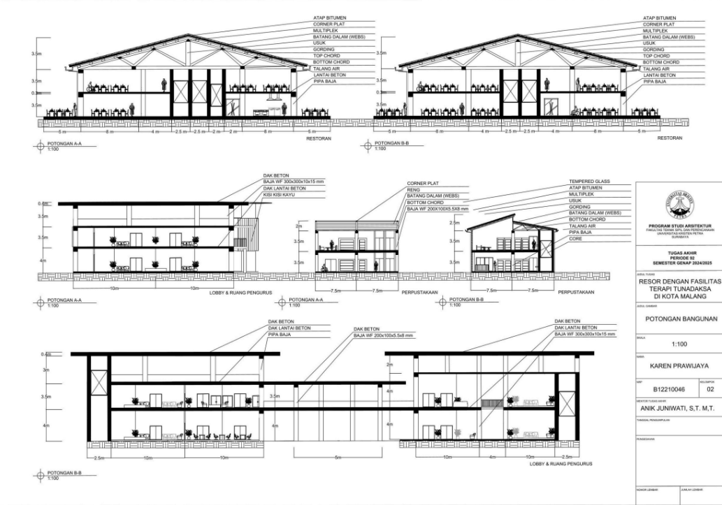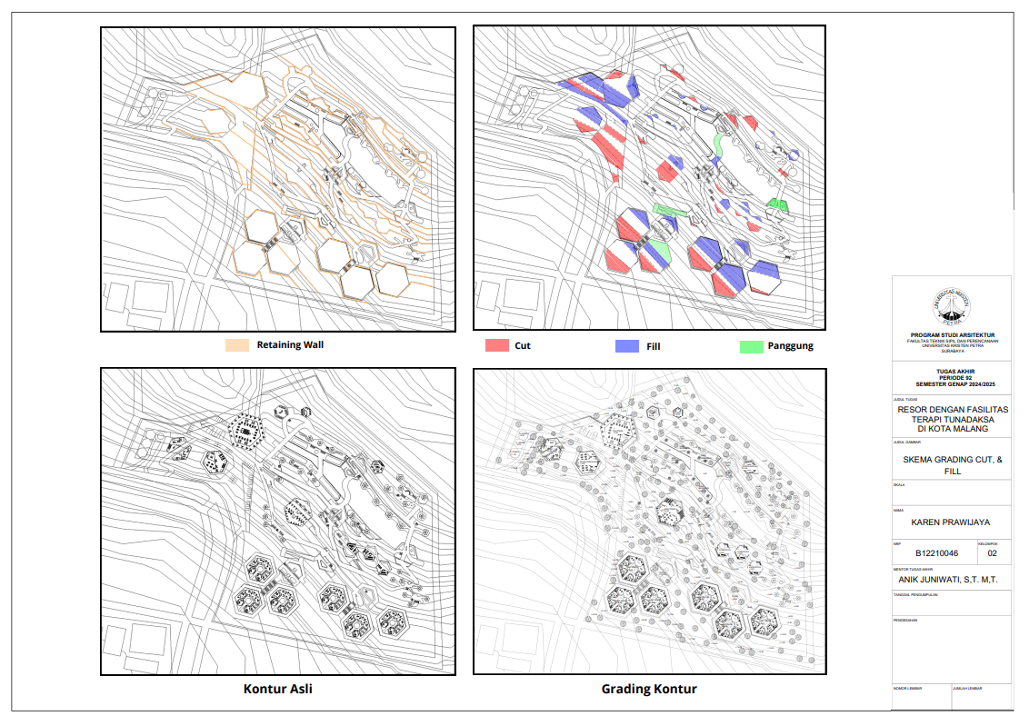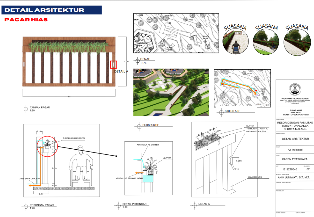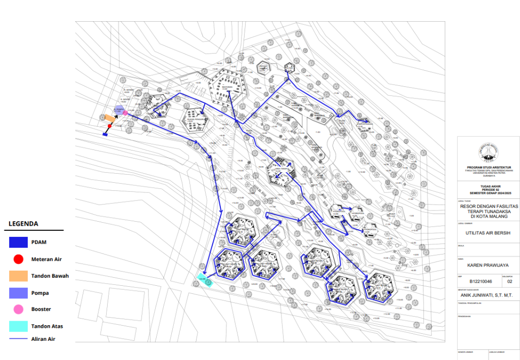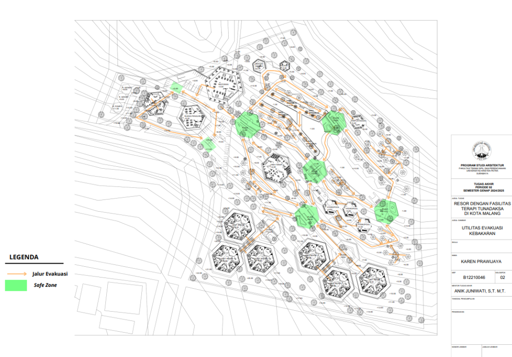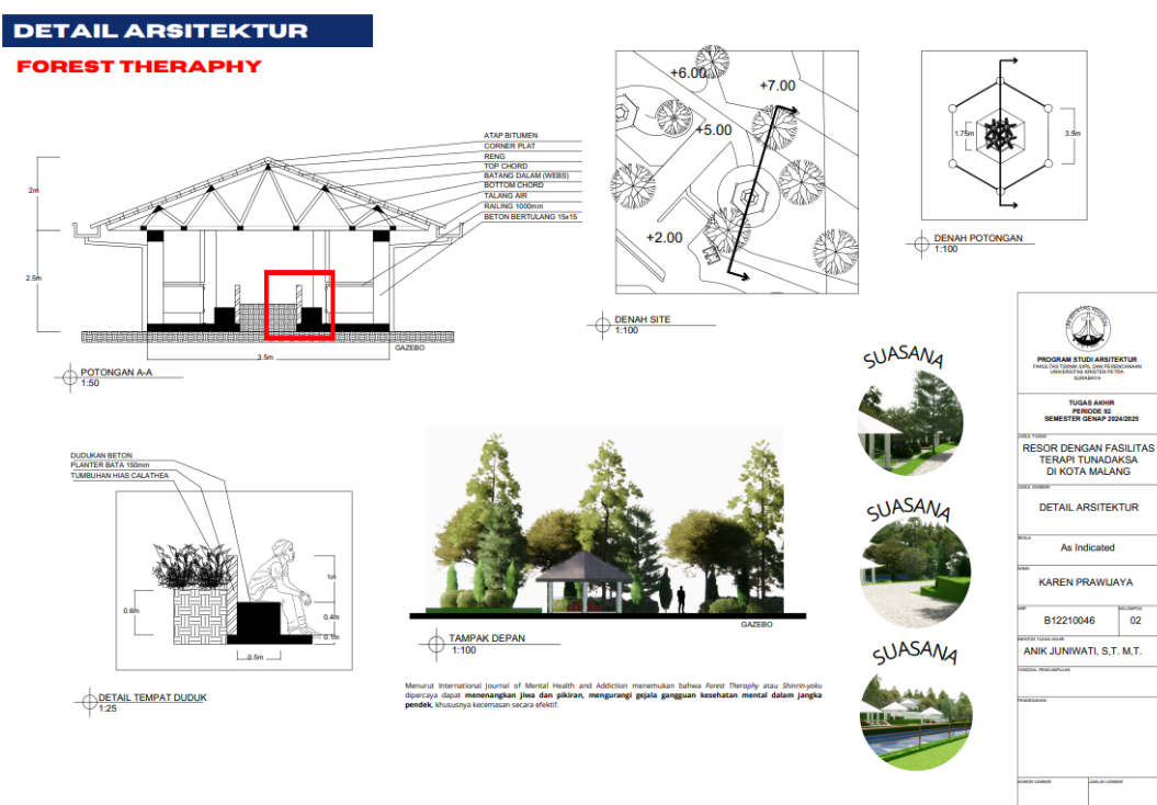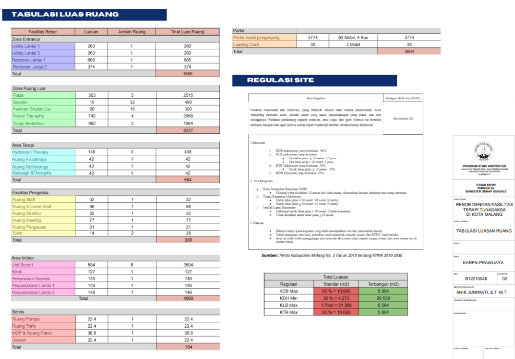 Kota Malang memiliki visi sebagai "Health City" yang mendorong tersedianya fasilitas pendukung kesehatan bagi seluruh kalangan, termasuk penyandang disabilitas. Namun, ketersediaan fasilitas wisata yang universal bagi tunadaksa masih sangat terbatas. Sehingga Resort dengan Fasilitas Terapi Tunadaksa dirancang sebagai tanggapan terhadap meningkatnya jumlah disabilitas, di sisi lain semua orang tanpa terkecuali memerlukan refreshing Konsep utama yang diangkat adalah Equitable Experience, yang artinya semua orang dapat mendapat pengalaman yang sama tanpa terkecuali. Salah satunya diwujudkan melalui perpaduan massa bangunan berbentuk segi enam guna menciptakan kesan menyambut sekaligus efisien dalam penataan ruang. Fasilitas terapi seperti fisioterapi, refleksologi, yoga, terapi berkebun, terapi pijat, hingga forest therapy dirancang secara terintegrasi dengan lanskap kontur dan sirkulasi universal agar dapat diakses tanpa hambatan oleh semua pengguna, baik penyandang disabilitas maupun non-disabilitas. Dengan pendekatan desain universal yang mempertimbangkan topografi, aksesibilitas, serta kebutuhan psikologis dan fisik pengguna, resort ini diharapkan dapat menjadi awal dalam pengembangan kawasan wisata terapi yang humanis dan berkelanjutan di Indonesia.