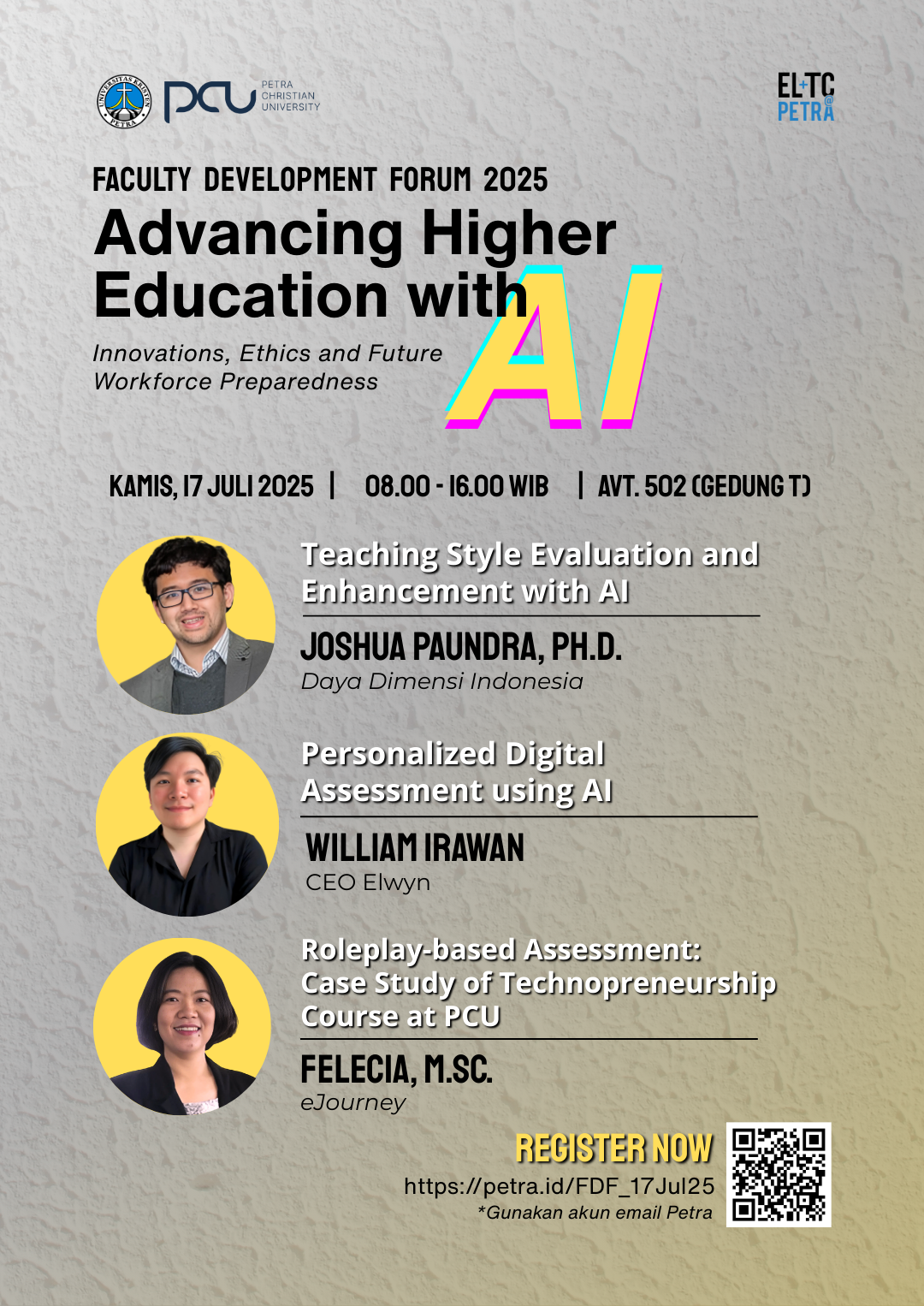 Kamis, 17 Juli 2025 jam 08.00 - 16.00 WIB bertempat di AV.T.502 Pusat Pengembangan Pembelajaran UK Petra mengadakan acara Faculty Development Forum 2025 dengan tema Advancing Higher Education with AI. Dengan beberapa narasumber, diantaranya Felecia, M.Sc. serta William Irawan dan Joshua Paundra, Ph.D.