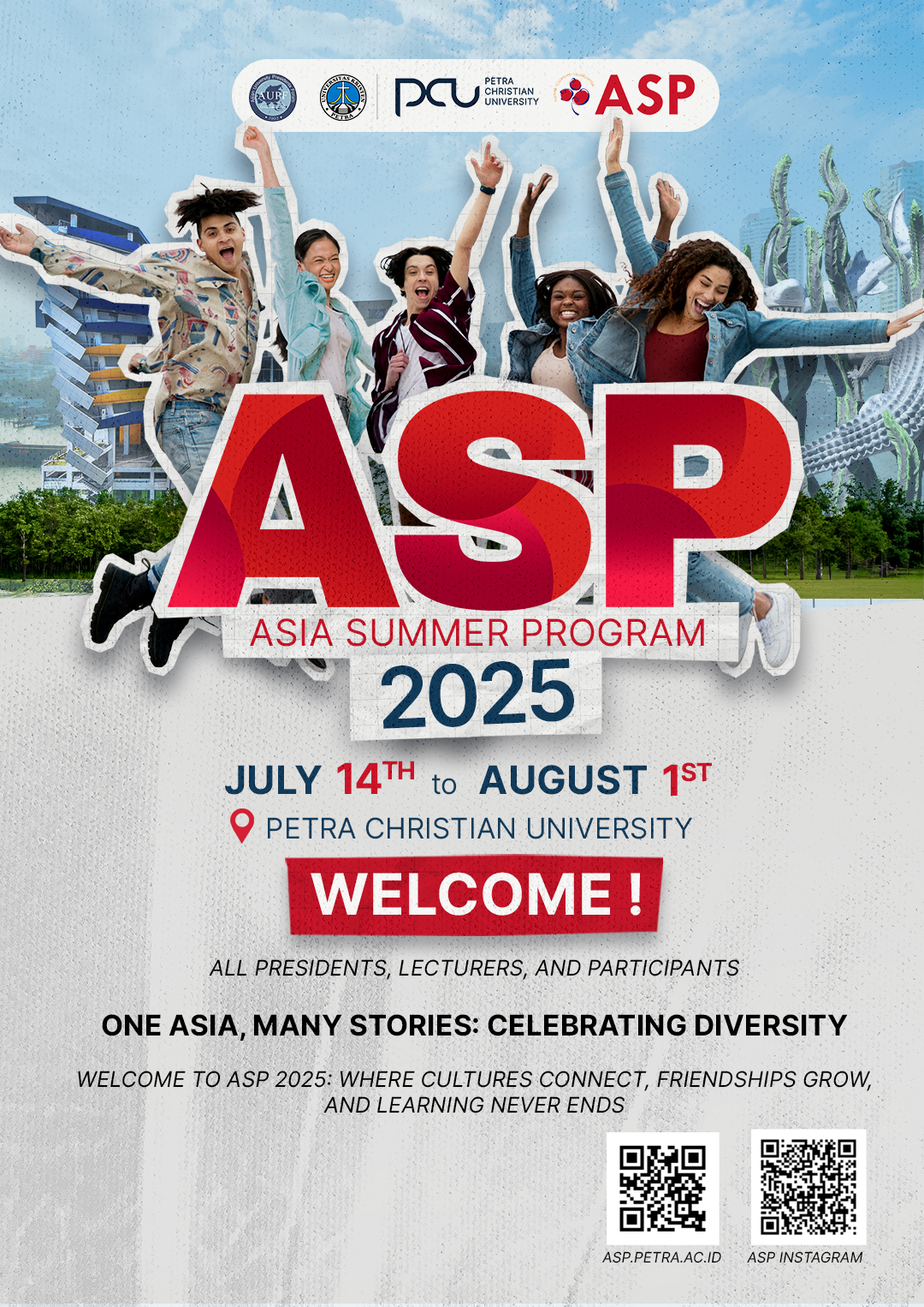 Asia Summer Program (ASP) adalah program musim panas internasional yang dinamis selama tiga minggu yang dirancang untuk membahas topik-topik yang relevan dengan Asia sekaligus mendorong koneksi global dan pengembangan keterampilan kepemimpinan. ASP 2025 akan diselenggarakan oleh Universitas Kristen Petra di Surabaya, Indonesia, dan menawarkan pengalaman tak terlupakan yang menggabungkan pembelajaran akademik, pemahaman budaya, serta kolaborasi lintas budaya.