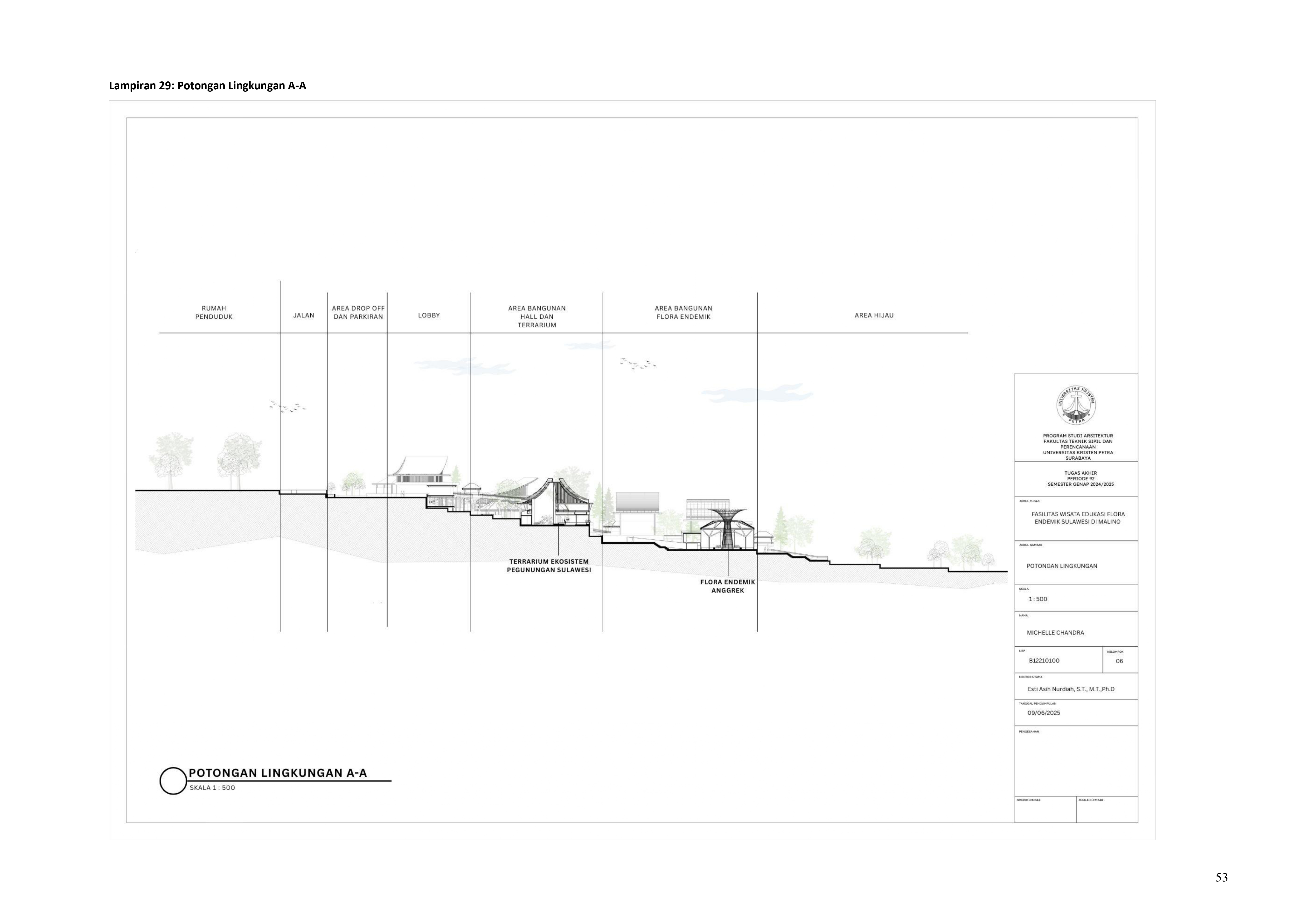 Perkembangan fasilitas edukasi saat ini menuntut perancangan ruang yang tidak hanya berfungsi sebagai media pembelajaran, tetapi juga mampu menjadi penghubung langsung antara manusia dan alam. Perancangan Fasilitas Wisata Edukasi Flora Endemik Sulawesi di Malino dilatarbelakangi oleh menurunnya kesadaran masyarakat terhadap pentingnya pelestarian flora lokal, yang semakin terancam oleh aktivitas pariwisata yang tidak terkontrol dan degradasi lingkungan. Untuk menjawab tantangan ini, pendekatan constructed ecosystem diterapkan sebagai strategi utama dalam perancangan. Pendekatan ini bertujuan untuk menciptakan lingkungan buatan yang meniru dan merepresentasikan sistem kerja ekosistem alami, sehingga mampu menghadirkan pengalaman ekologis secara nyata dalam konteks ruang arsitektur. Melalui metode studi literatur, observasi lapangan, dan analisis tapak, desain dikembangkan ke dalam bentuk terarium besar, ruang interpretatif, jalur edukatif, serta zona konservasi semi-terbuka yang saling terhubung secara fungsional dan ekologis. Setiap elemen ruang dirancang tidak hanya untuk menampilkan keanekaragaman flora endemik Sulawesi, tetapi juga menciptakan sistem mikroklimat yang mendukung pertumbuhan tanaman dan kenyamanan pengunjung. Ruang-ruang ini saling terhubung dan memberi pengalaman langsung dengan ekosistem buatan, untuk menumbuhkan kesadaran akan pentingnya lingkungan. Proyek ini bertujuan menjadi contoh arsitektur edukatif yang peduli lingkungan, melibatkan masyarakat, dan berdampak langsung pada konservasi.