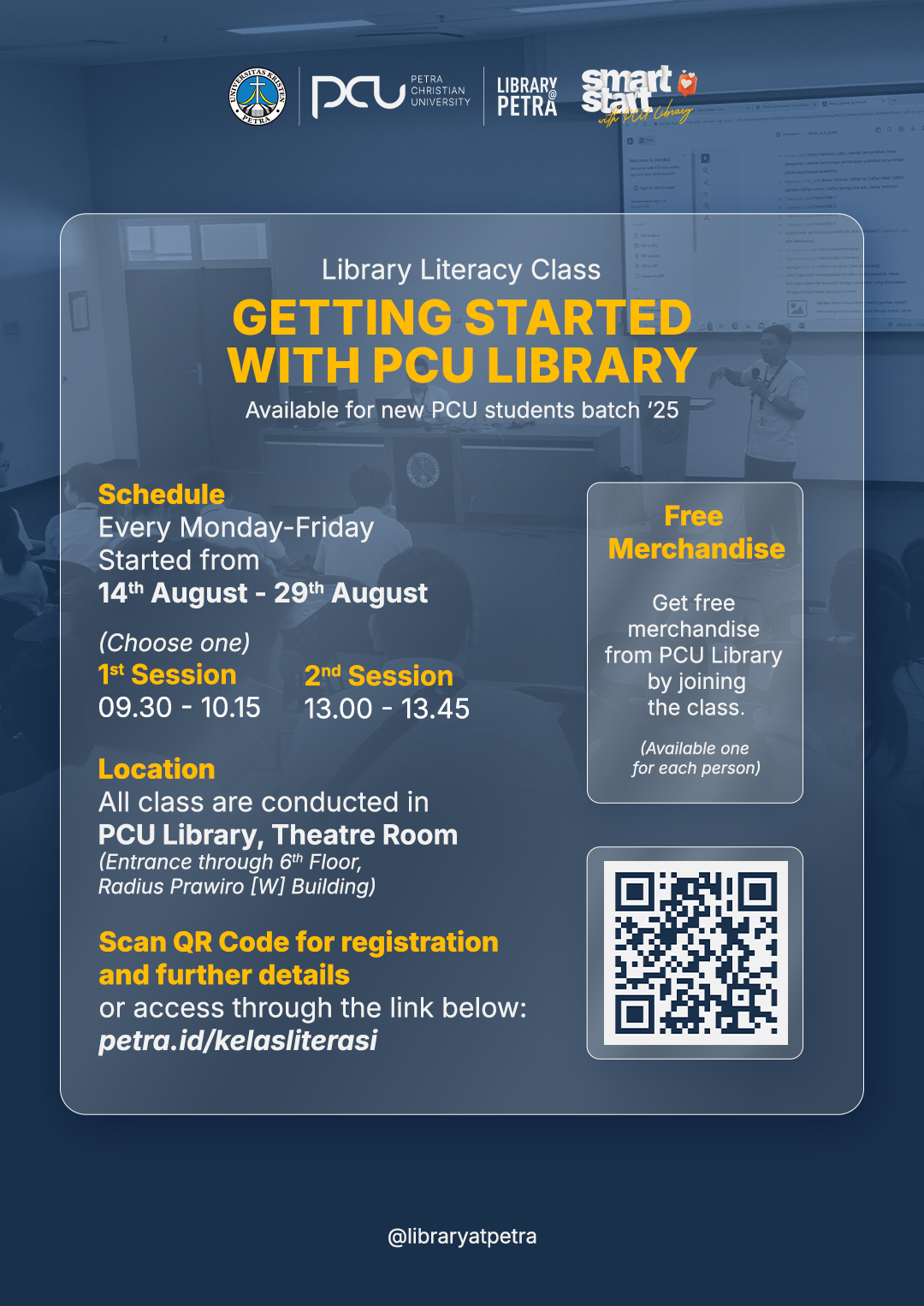 Dalam rangka menyambut perkuliahan di semester baru di tahun 2025/2026, Perpustakaan UK Petra mengadakan kelas pengenalan perpustakaan untuk mahasiswa baru. Jadwal kelas literasi ini diselenggarakan pada 14 - 19 Agustus 2025.