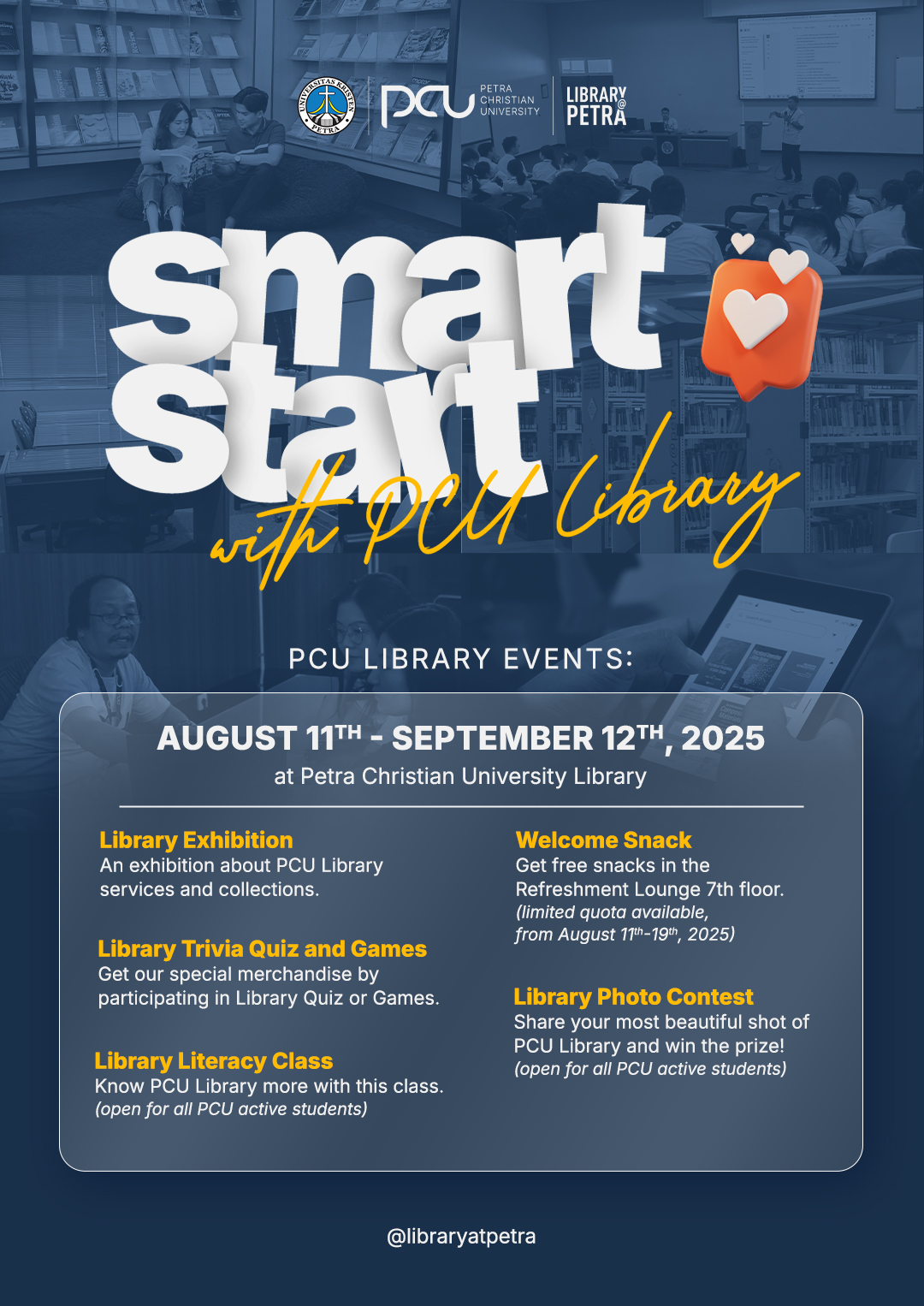 Smart Start with PCU Library mengusung semangat awal yang inspiratif untuk menyambut mahasiswa baru dalam mengawali semester baru, di mana mahasiswa didorong untuk memulai perjalanan literasi mereka dengan penuh semangat, rasa ingin tahu, dan motivasi tinggi yang berawal di Perpustakaan UK Petra. Melalui berbagai kegiatan seperti Library Exhibition, Library Trivia Quiz and Games, Library Literacy Class tentang pengenalan perpustakaan, kelas e-resources, pelatihan plagiarisme dan Turnitin, pelatihan Mendeley, dan pelatihan Zotero. Mahasiswa tidak hanya diajak untuk mengenal perpustakaan, tetapi juga untuk meningkatkan kemampuan dalam menggunakan tools yang berguna untuk mendukung perkuliahan dan akan ada Welcome Snack dan Library Photo Contest untuk memeriahkan rangkaian kegiatan. Acara ini berlangsung hingga 12 September 2025