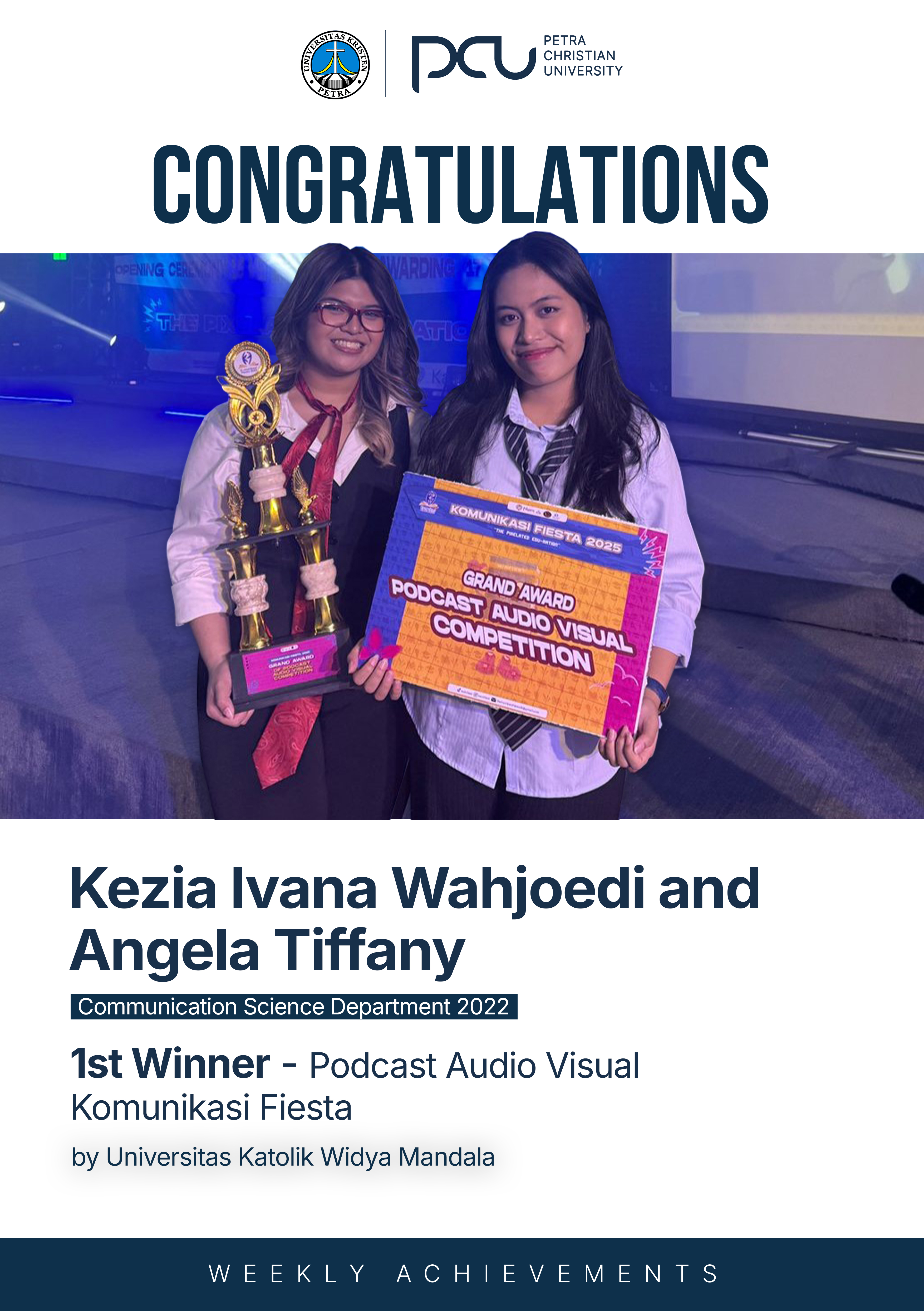 Selamat atas prestasi yang diraih oleh Kezia Ivana Wahjoedi dan Angela Tiffani sebagai 1st Winner dalam Podcast Audio Visual Komunikasi Fiesta by Universitas Katolik Widya Mandala