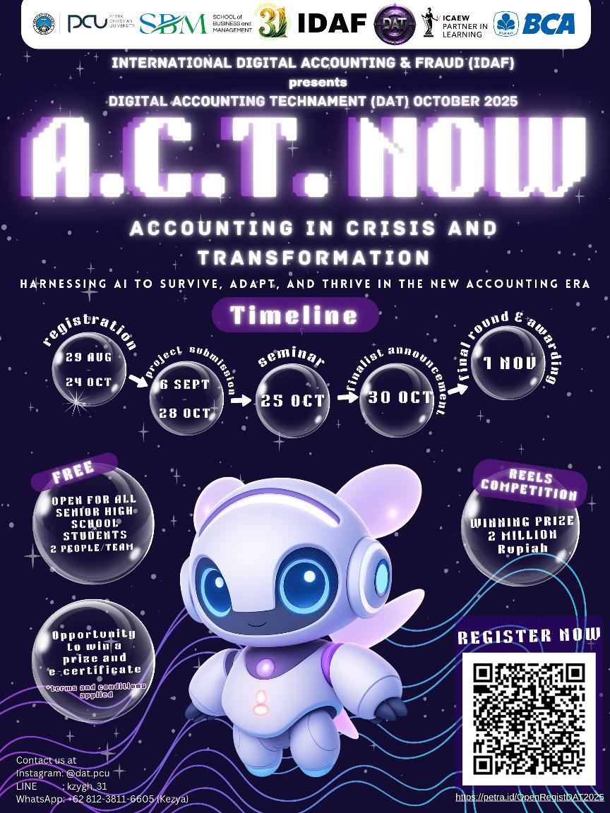 Digital Accounting Technament (DAT) Oktober 2025 adalah kompetisi daring yang dirancang untuk meningkatkan pemahaman peserta tentang akuntansi digital dan tantangan yang muncul di era digitalisasi. Mengusung tema "ACT: Akuntansi dalam Krisis dan Transformasi" dan subtema "Memanfaatkan AI untuk Bertahan, Beradaptasi, dan Berkembang di Era Akuntansi Baru", kompetisi ini menyoroti bagaimana generasi muda dapat mengoptimalkan Kecerdasan Buatan sebagai strategi untuk bertahan, bertransformasi, dan berkembang di dunia akuntansi saat ini.
