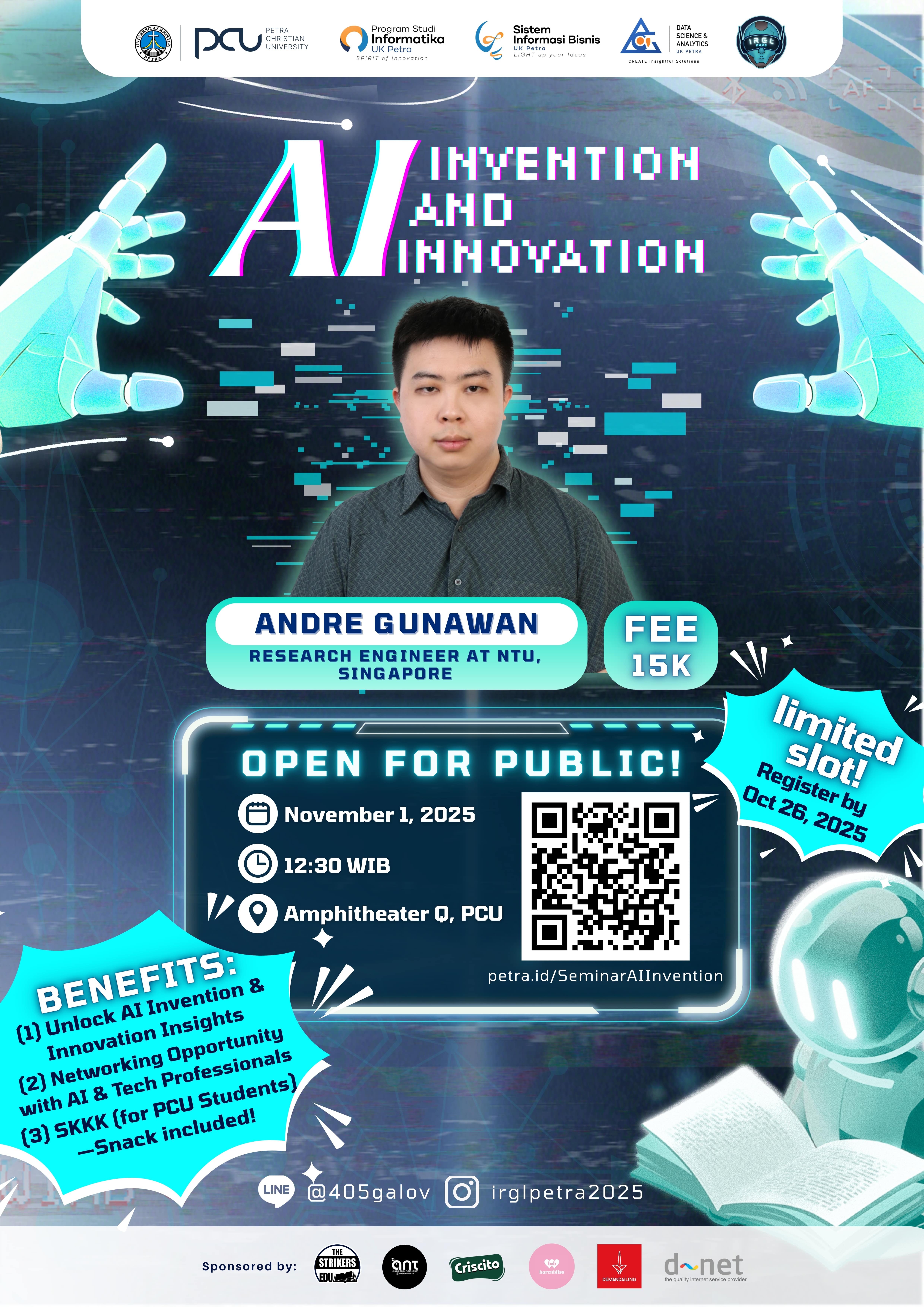 Seminar “AI Invention and Innovation” menghadirkan Andre Gunawan, alumni Business Information Systems PCU dan Research Engineer di NTU Singapore, yang akan membagikan wawasan seputar penerapan serta potensi inovasi kecerdasan buatan (AI) di dunia industri dan riset. Acara ini juga menjadi kesempatan bagi peserta untuk memperluas jaringan profesional di bidang AI dan teknologi, sekaligus memperoleh SKKK bagi mahasiswa PCU. Dengan narasumber Andre Gunawan dari NTU Singapore seminar ini diselenggarakan pada 01 November 2025 bertempat di Amphitheater Q.