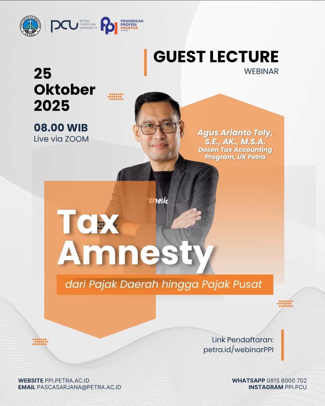 GUEST LECTURE PPI UK PETRAKami mengundang Anda untuk bergabung dalam webinar eksklusif bersama:๐๏ธ Agus Arianto Toly, S.E., Ak., M.S.A.Dosen Tax Accounting Program, Universitas Kristen Petra๐ Sabtu, 25 Oktober 2025๐ Pukul 08.00 WIB๐ Live via ZOOM๐ Topik: Tax Amnesty โ dari Pajak Daerah hingga Pajak PusatPahami lebih dalam tentang kebijakan pengampunan pajak di Indonesia, mulai dari level daerah hingga nasional. Webinar ini akan membahas latar belakang, implementasi, serta dampaknya terhadap wajib pajak dan pemerintah.๐ Link pendaftaran: petra.id/webinarPPIJangan lewatkan kesempatan untuk belajar langsung dari ahlinya!