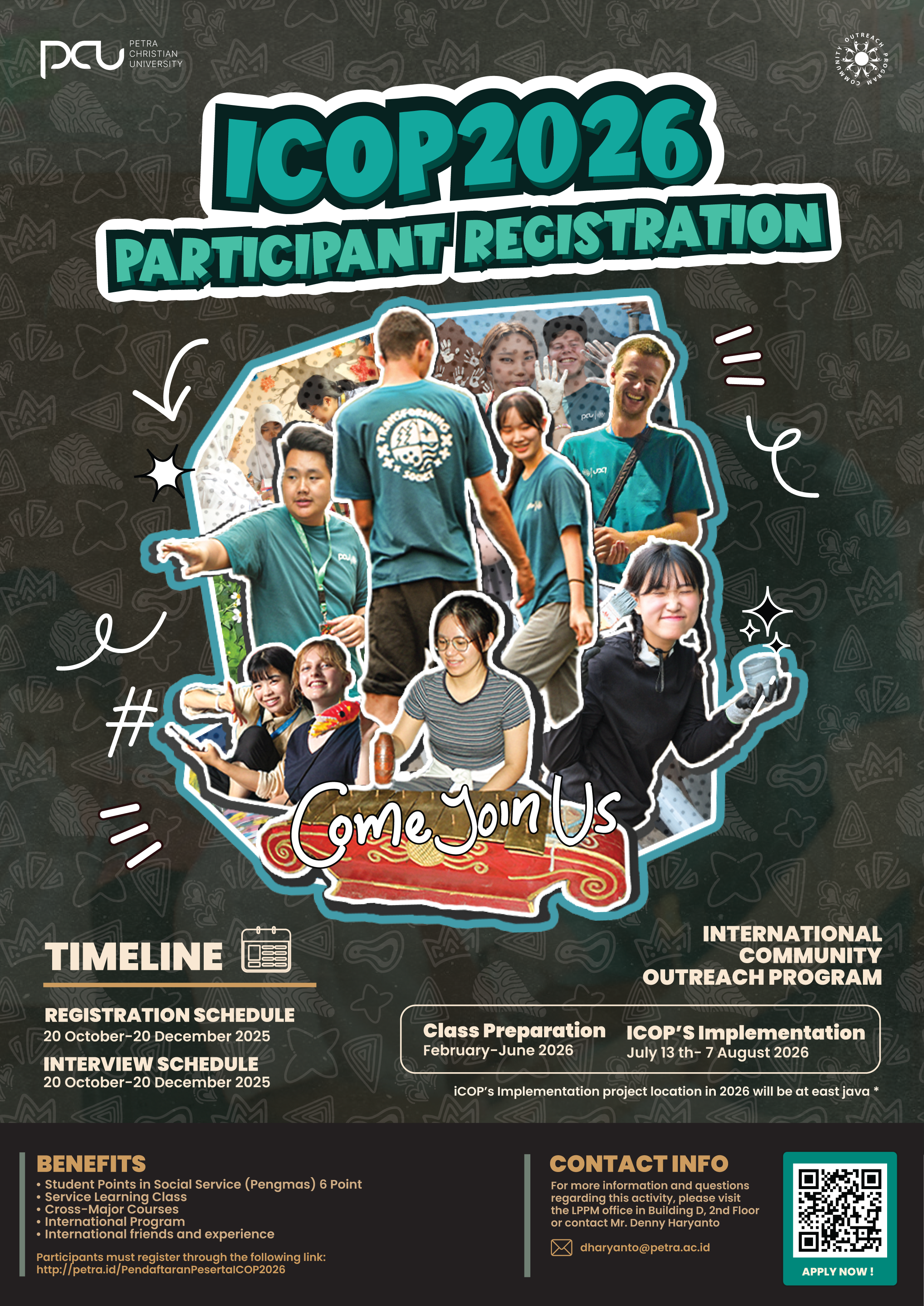 Untuk itu UK Petra kembali membuka pendaftaran baik pendaftaran sebagai PESERTA bagi mahasiswa UK Petra untuk menjadi bagian sebagai PANITIA International Community Outreach Program i(COP) 2026. iCOP International 2026 akan digelar secara ONSITE di Jawa Timur.