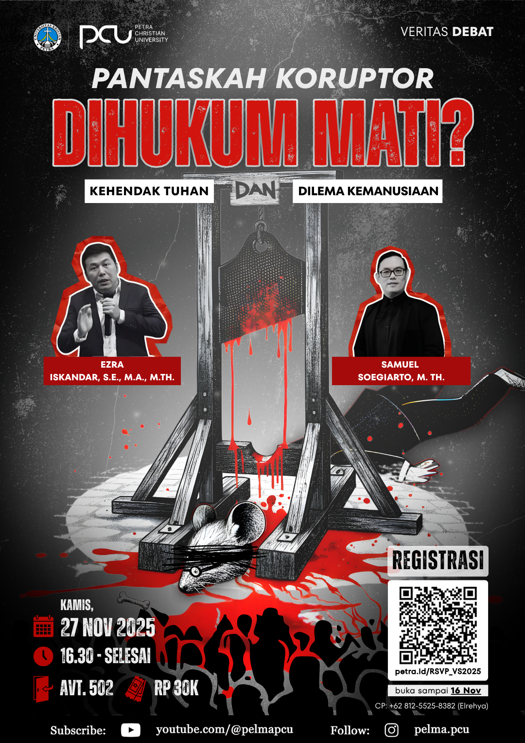 Veritas Debat kembali hadir dengan mosi kontroversial: "Pantaskah Koruptor Dihukum Mati?" Ini adalah ruang diskusi kritis yang mengajak para peserta untuk menguji batas nalar dan iman dalam menilai kejahatan besar negara. Melalui format debat publik, yang mempertemukan pandangan Retributif (balas setimpal) dan Restoratif (penebusan), kami ingin membekali para peserta dengan kerangka berpikir Kristiani yang kokoh untuk membentuk opini pribadi yang berakar pada firman Tuhan. Acara veritas debat diselenggarakan pada 27 November 2025 jam 16.30 WIB bertempat di AV.T.502 dengan narasumber Ezra Iskandar, S.E., M.A., M.Th., serta Samuel Soegiarto, M.Th.