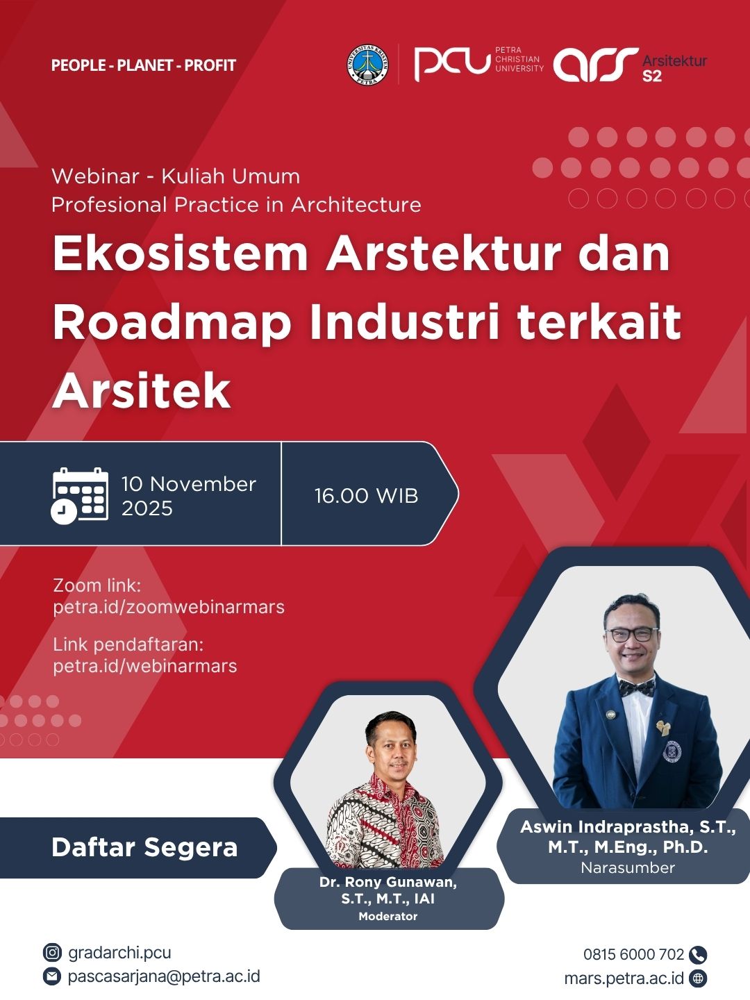 Webinar Kuliah Umum: Profesional Practice in Architecture✨ Ekosistem Arsitektur dan Roadmap Industri terkait Arsitek ✨📅 Tanggal: 10 November 2025🕓 Waktu: 16.00 WIB📍 Platform: Zoom🎙 Narasumber: Aswin Indraprastha, S.T., M.T., M.Eng., Ph.D.🎙 Moderator: Dr. Rony Gunawan, S.T., M.T., IAILink Zoom: petra.id/zoomwebinarmarsRegistrasi: petra.id/webinarmarsJangan lewatkan kesempatan untuk memahami ekosistem arsitektur dan roadmap industri yang akan membentuk masa depan profesi arsitek!People-Planet-Profit#scholarshipmarsukp #marsukpetra #mars #ukpetra #pcu #magister #pascasarjana #arsitektur #kuliahtamu #WebinarArsitektur #PetraUniversity #ArsitekturS2 #PeoplePlanetProfit #KuliahUmum