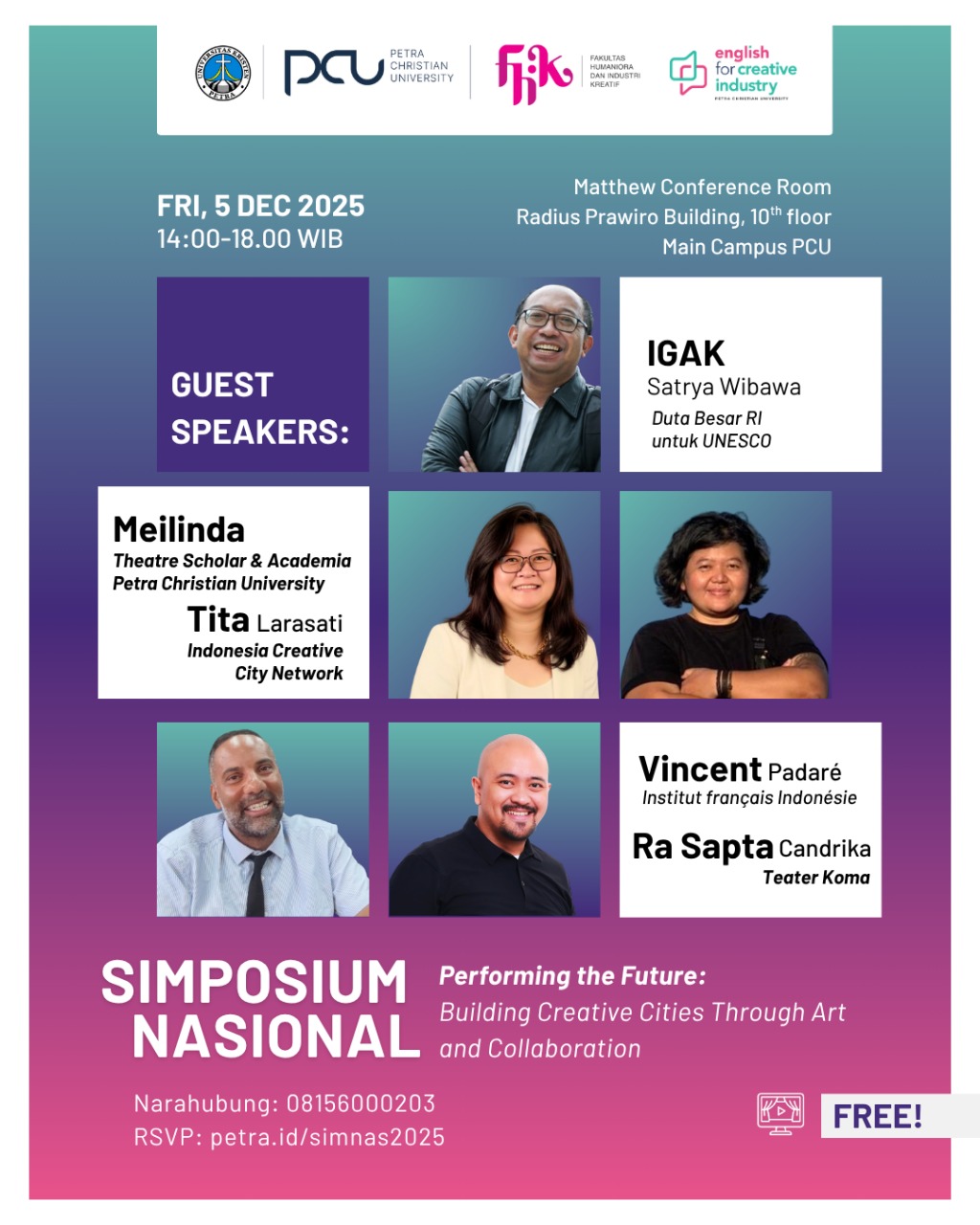 Kota seperti apa yang dibayangkan seniman teater untuk hidup & berkarya? Yuk ngobrol bareng leaders, seniman & akademisi dari UNESCO, ICCN, PCU & IFI! 📅 5 Des | 🕑 14.00–18.00 WIB | 📍 Matthew Conference Hall, UK Petra Gratis! RSVP: petra.id/simnas2025