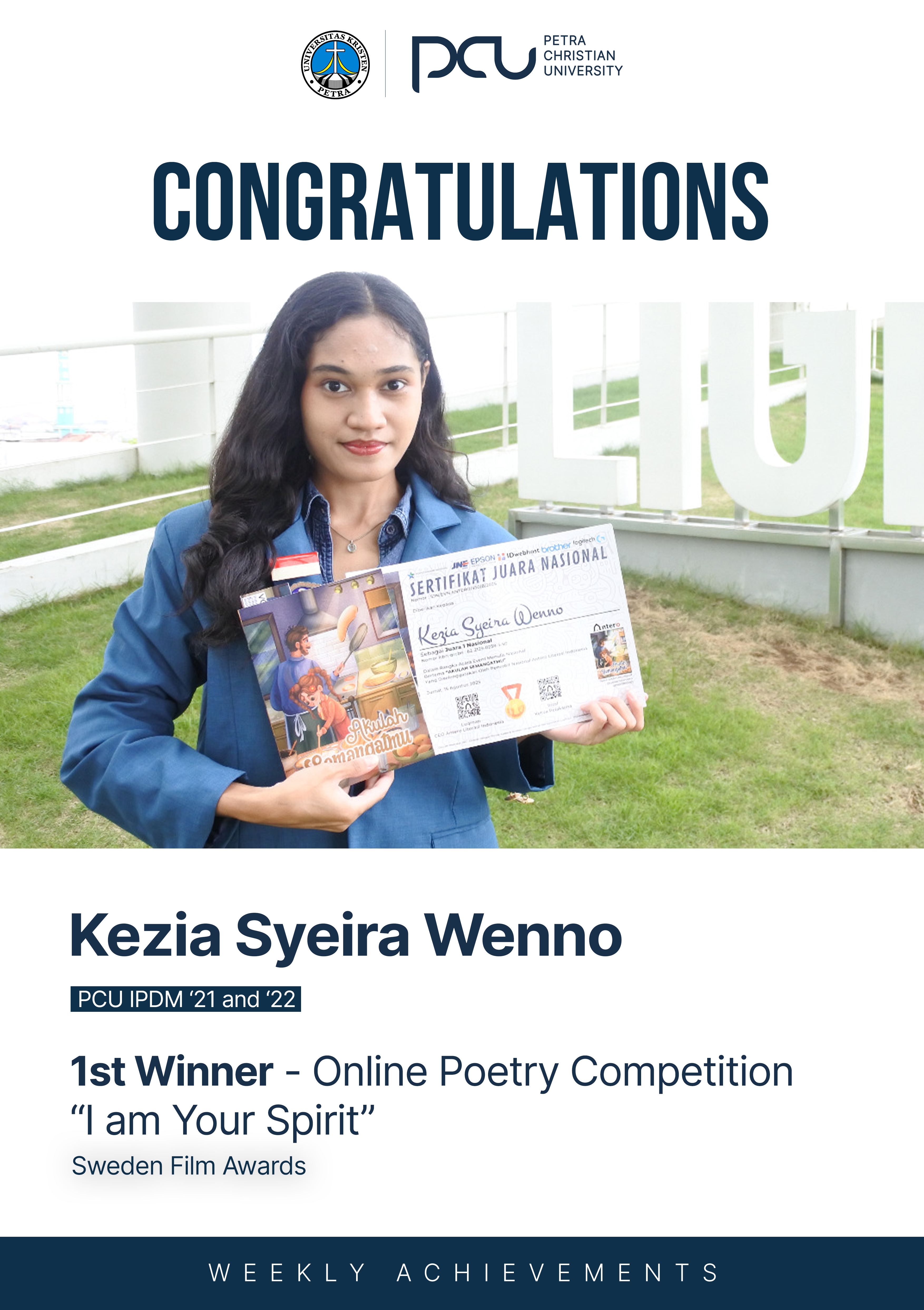 Selamat atas prestasi yang diraih oleh Kezia Syeira Wenno sebagai 1st Winner dalam Online Poetry Competition "I am Your Spirit" by Sweden Film Awards