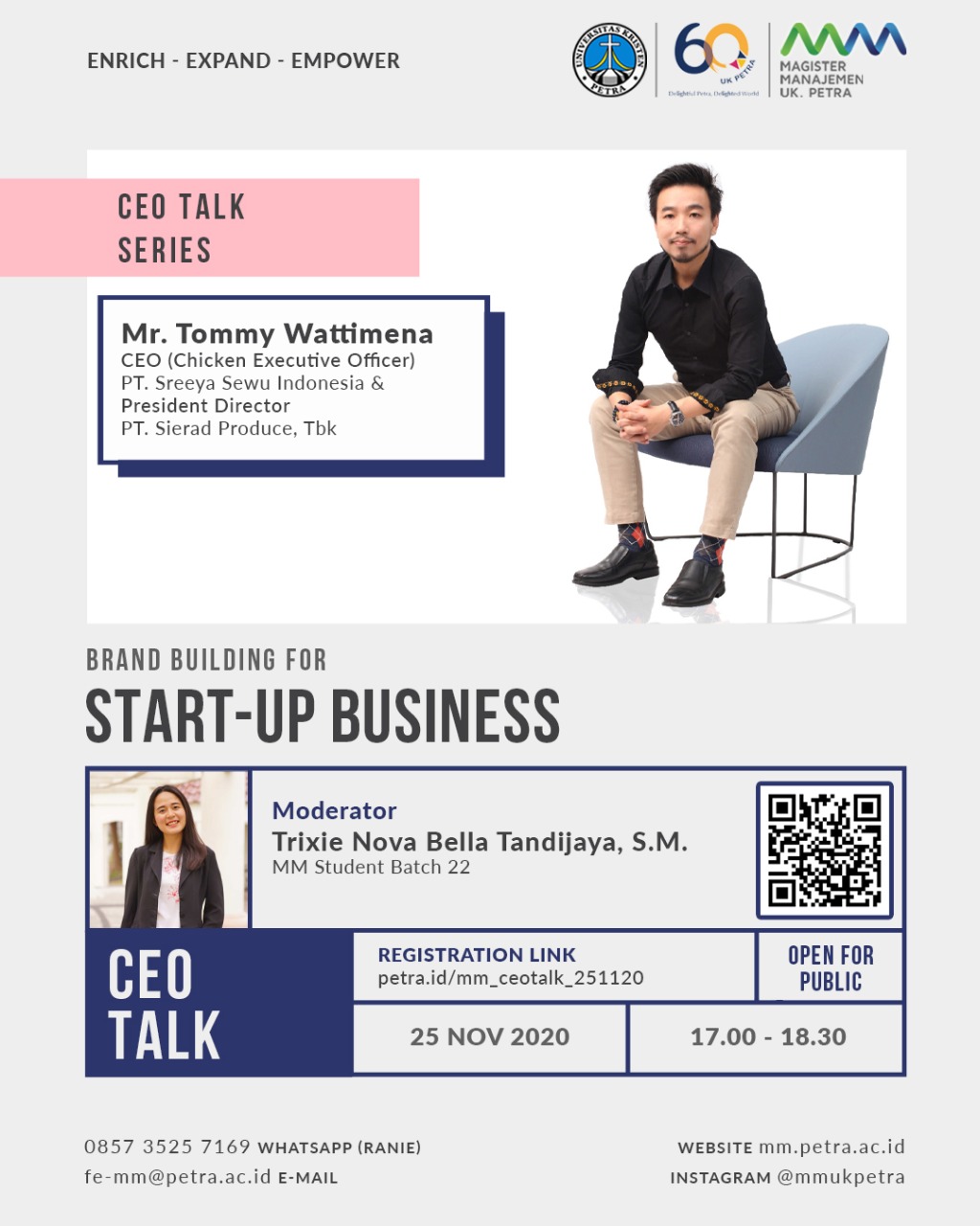 Program Studi Magister Manajemen UK Petra pada tanggal 25 November 2020 jam 17.00 - 18.30 WIB mengadakan acara CEO talk dengan tema brand building for start-up business. Dengan narasumber Tommy Wattimena dan sebagai moderator Trixie Nova Bella T. Acara ini diadakan secara online.