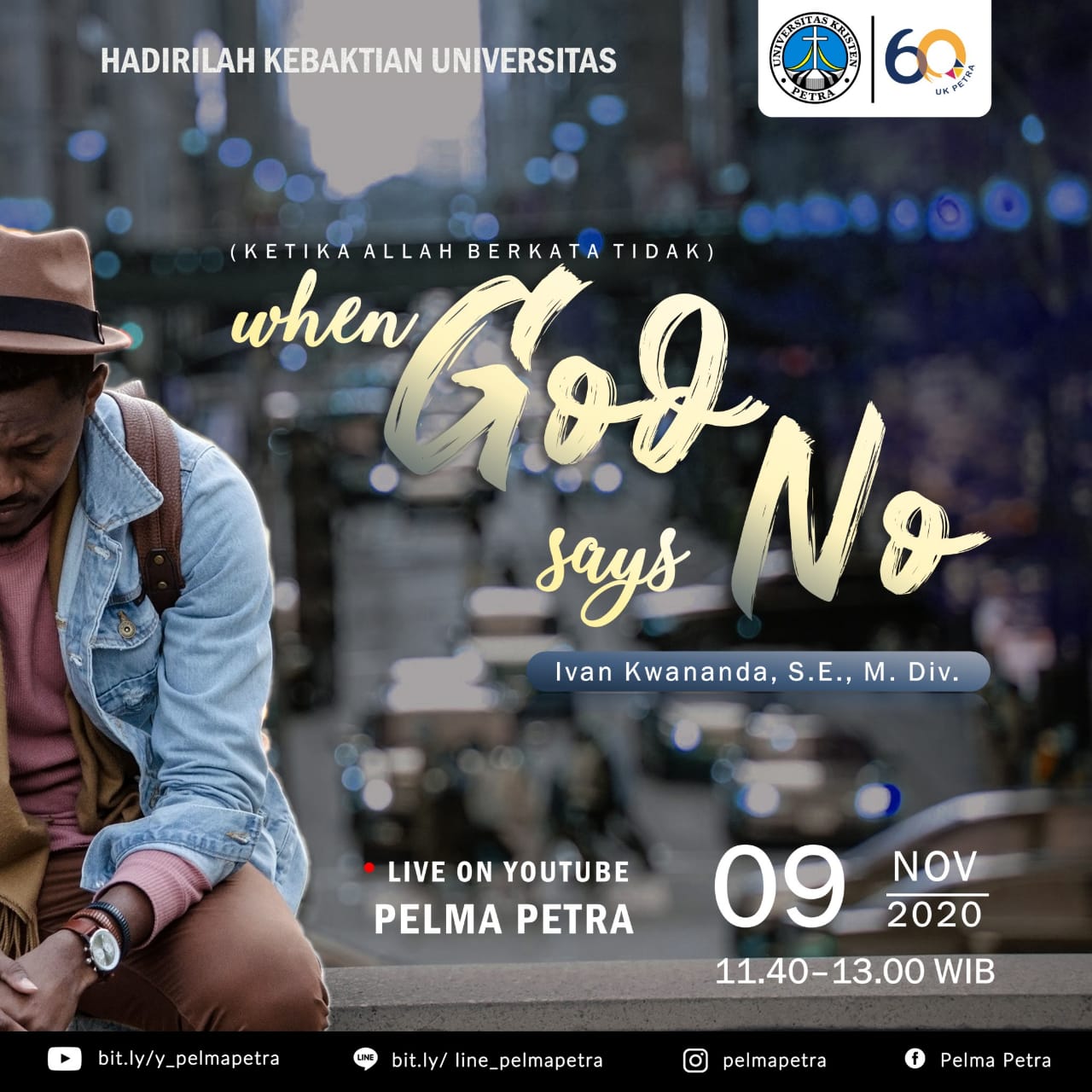 Pusat kerohanian UK Petra, kembali mengundang civitas UK Petra untuk ikut dalam Kebaktian Universitas yang diselenggarakan pada Senin, 09 November 2020 jam 11.40 - 13.00 WIB. Dengan Pengkhotbah Iwan Kwananda, S.E., M.Div. Kebaktian ini diselenggarakan secara online melalui channel Youtube Pelma Petra.