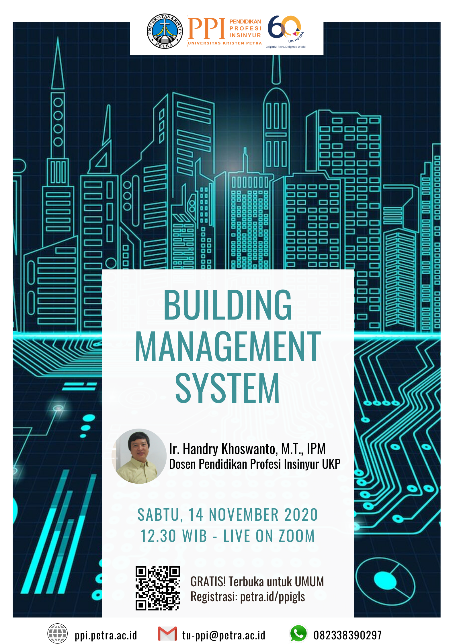 Program Pendidikan Profesi Insinyur UK Petra menyelenggarakan webinar dengan tema Building Management System. Acara ini diselenggarakan pada Sabtu, 14 November 2020 jam 12.30 WIB. Acara ini diselenggarakan secara online, melalui aplikasi Zoom Meeting, dengan narasumer Ir. Handry Kriswanto, M.T.
