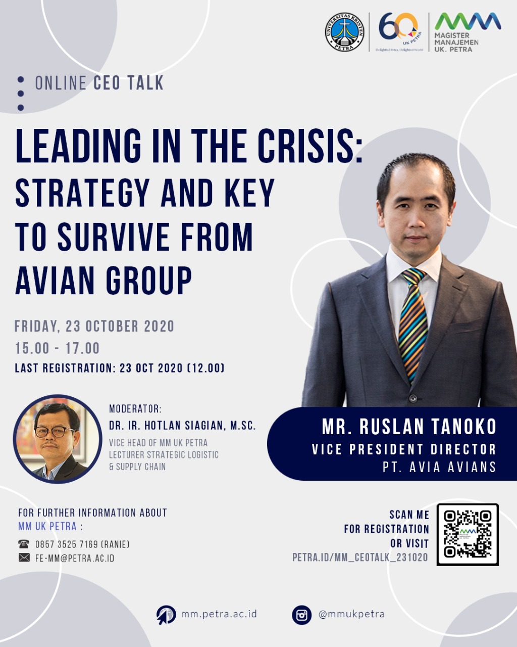 Pada 23 Oktober 2020 jam 15.00 - 17.00 WIB, Program Studi Magister Manajemen UK Petra menyelenggarakan acara CEO talk dengan tema "leading in the crisis: strategy and key to survive from Avian Group". dengan narasumber Ruslan Tanoko Vice President Director PT Java Aviants. Acara ini diselenggarakan secara online.
