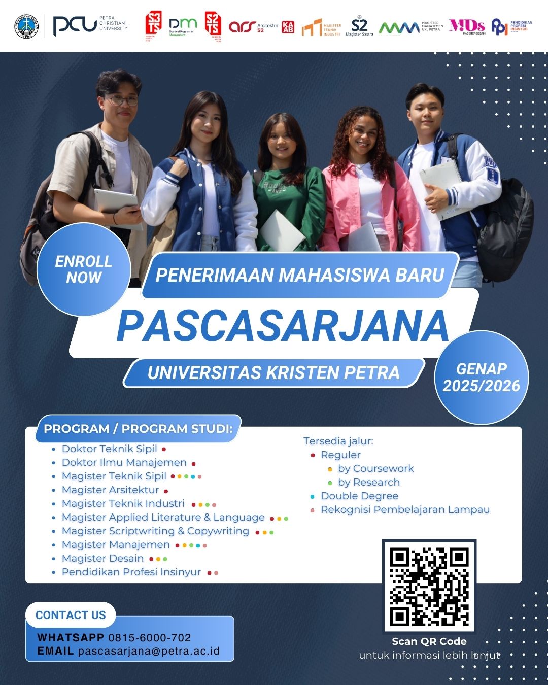 π Raih Gelar Pascasarjana di Universitas Kristen Petra β Pendaftaran Telah Dibuka!Universitas Kristen Petra membuka kesempatan bagi para profesional, akademisi, dan lulusan sarjana untuk melanjutkan studi ke jenjang yang lebih tinggi melalui program Pascasarjana yang unggul dan relevan dengan kebutuhan zaman.π Program Studi yang Ditawarkan:Doktor Teknik SipilDoktor Ilmu ManajemenMagister Teknik SipilMagister ArsitekturMagister Teknik IndustriMagister Applied Literature & LanguageMagister Scriptwriting & CopywritingMagister ManajemenMagister DesainPendidikan Profesi Insinyurπ‘ Pilihan Jalur Studi:Regulerby Courseworkby ResearchDouble DegreeRekognisi Pembelajaran Lampau (RPL)Dengan pendekatan akademik yang komprehensif, fasilitas modern, dan dosen berpengalaman, UK Petra siap mendampingi Anda dalam mengembangkan kompetensi dan memperluas wawasan di bidang yang Anda tekuni.π Periode Pendaftaran: Semester Genap 2025/2026π² Informasi & Pendaftaran:WhatsApp: 0815-6000-702Email: pascasarjana@petra.ac.idπ Scan QR Code pada poster untuk info lebih lanjutMari wujudkan masa depan yang lebih cerah bersama Pascasarjana UK Petra.