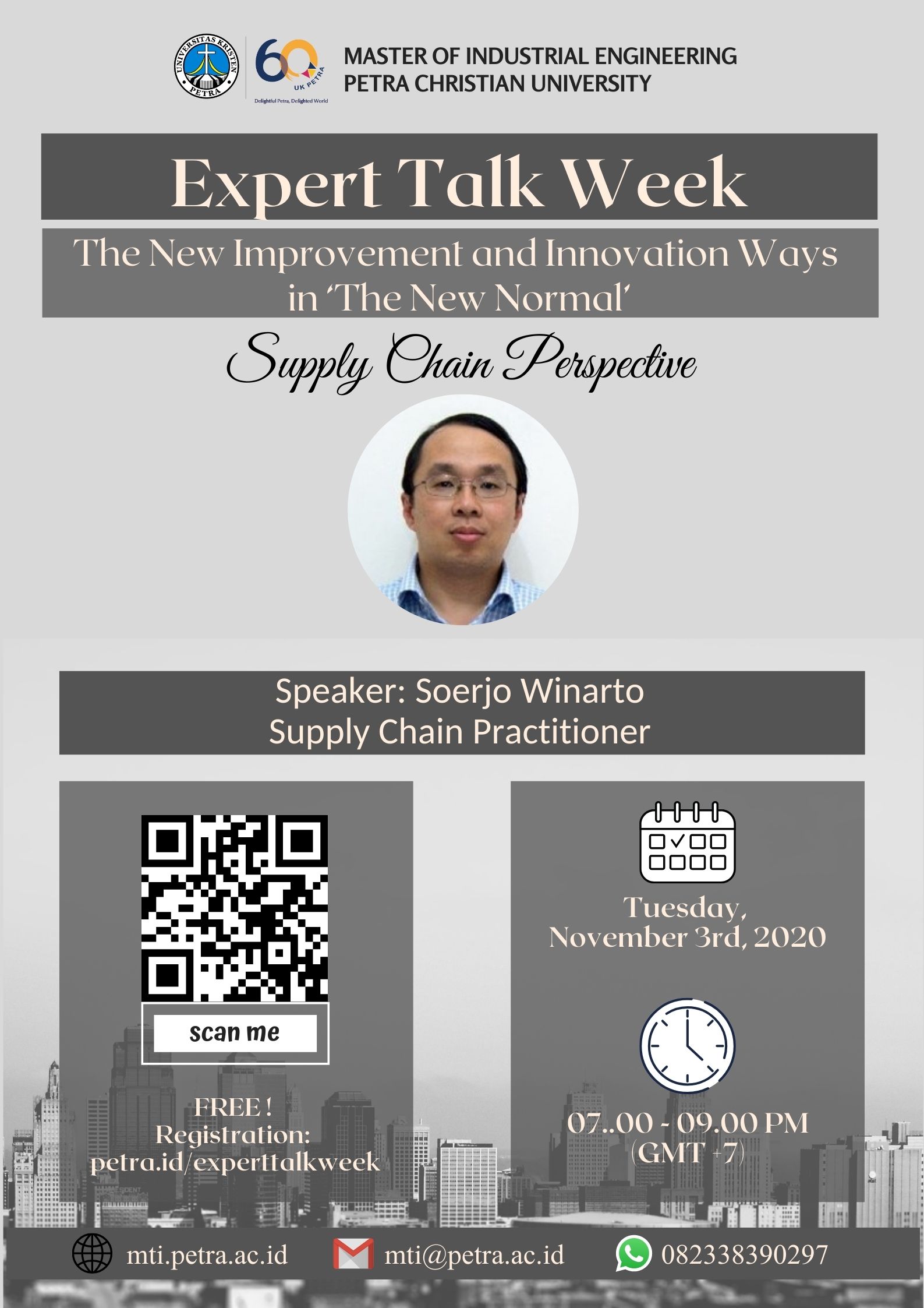 Magister Teknik Industri UK Petra Surabaya, mengadakan acara Expert talk week "Supply Chain Perspective". Acara ini diadakan pada tanggal 3 November 2020 jam 19.00 - 21.00 WIB. Dengan narasumber bapak Soerjo Winarto. Acara ini berlangsung secara online.