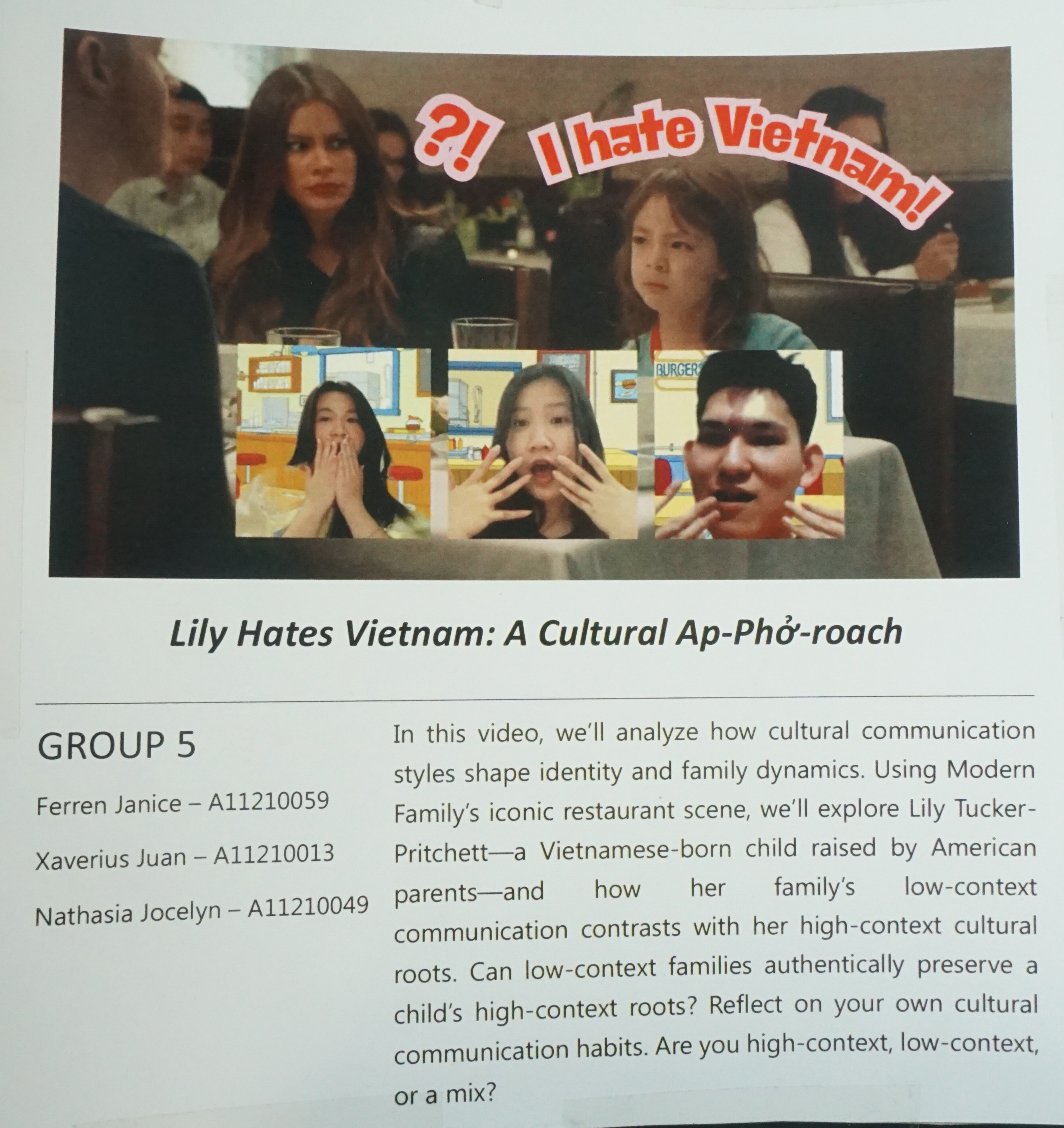 Poster ini dibuat untuk final project exhibition dari mahasiswa Program Studi English for Creative Industry. Salah satu materi pameran adalah Lily hates Vietnam: a cultural ap-pho-roachn.