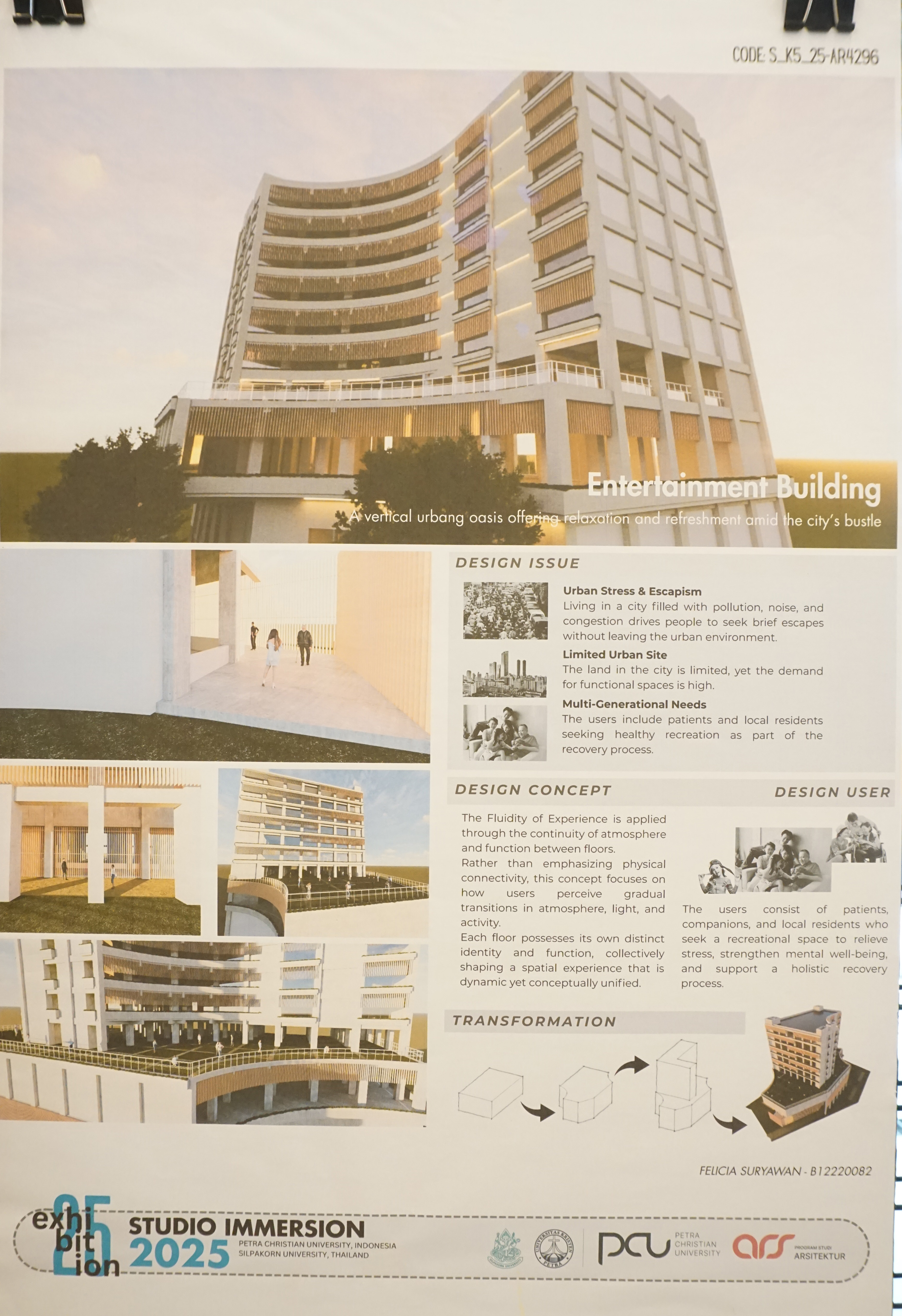 Salah satu karya yang dipamerkan adalah Entertainment building: a vertical urbang oasis offering relaxation and refreshment amid the city's bustle karya dari Felicia Suryawan (B12220082)