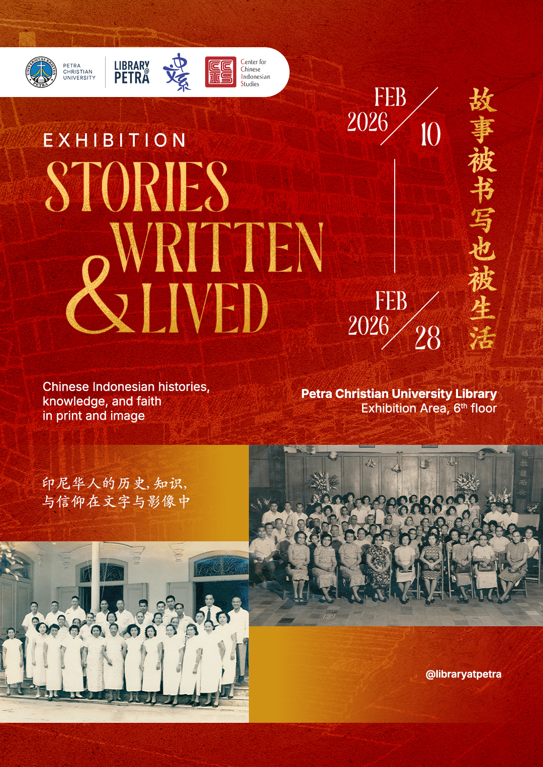 Pameran ini menampilkan materi dari CCIS, bagian dari koleksi khusus Perpustakaan Universitas Kristen Petra, dan mengeksplorasi pengalaman Tionghoa Indonesia melalui tema “Kisah Tertulis dan Kehidupan”. Pameran ini menyajikan dua bentuk penceritaan yang saling terkait. Narasi tertulis disajikan melalui buku dan makalah penelitian yang mengkaji identitas, sejarah, dan kehidupan intelektual Tionghoa Indonesia. Narasi kehidupan disampaikan melalui foto-foto arsip yang mendokumentasikan perkembangan penginjilan di Indonesia oleh keturunan Tionghoa Indonesia, yang menangkap momen-momen misi, pelayanan, dan kehidupan komunitas. Pameran ini juga menampilkan karya mahasiswa yang menggambarkan akulturasi budaya pernikahan Tionghoa dan Indonesia yang dikenal sebagai “Cina Benteng”, menyoroti dimensi lain dari kehadiran Tionghoa Indonesia dalam masyarakat Indonesia. Pameran ini diselenggarakan pada 09-28 Februari 2026 di ruang pamer perpustakaan lantai 6 gedung Radius Prawiro.