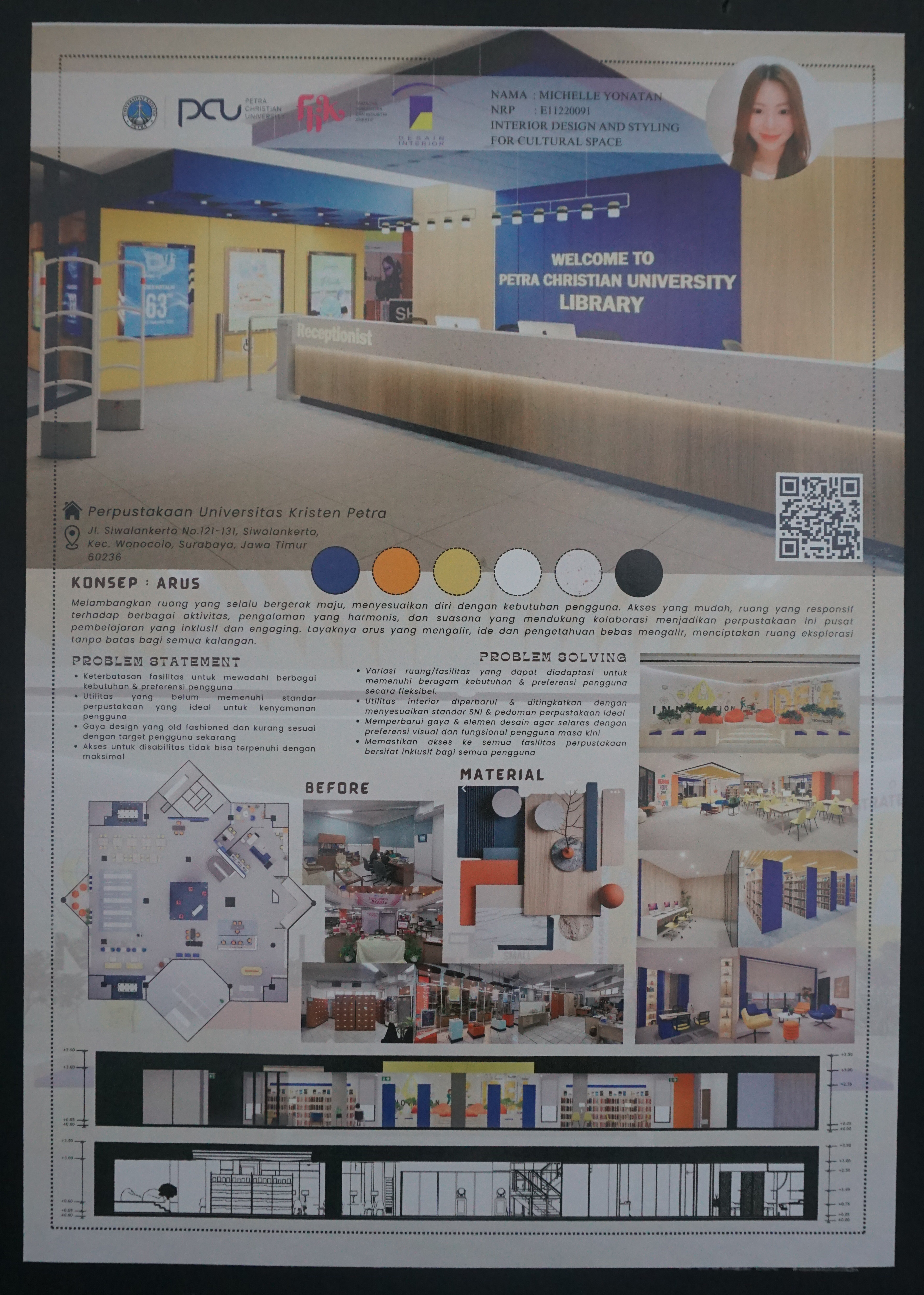 Dalam rangka menyemarakkan 27 tahun Prodi Desain Interior diselenggarakan seminar Insight bersama alumni dan pengguna lulusan, serta rangkaian acara IDE+ (Interior Design Exhibition and Workshop) 18-20 Juni 2025 yang menyajikan berbagai karya mata kuliah Personal Space, Presentasi Visual, Interior Design for Workspace, Furniture Design for Workspace, Interior Design for Cultural Space, Interior Product Design For Cultural Space, Craft and Furnishing, dan LEAP Final Project. Dalam pameran IDE+ tahun ini disajikan pula hasil karya kolaborasi project based learning Prodi Desain Interior PCU - UCSI dan UiTM. Salah satu materi pameran ini ialah Perpustakaan Universitas Kristen Petra: interior design and styling cultural space. Karya Michelle Yonathan (E11220091)