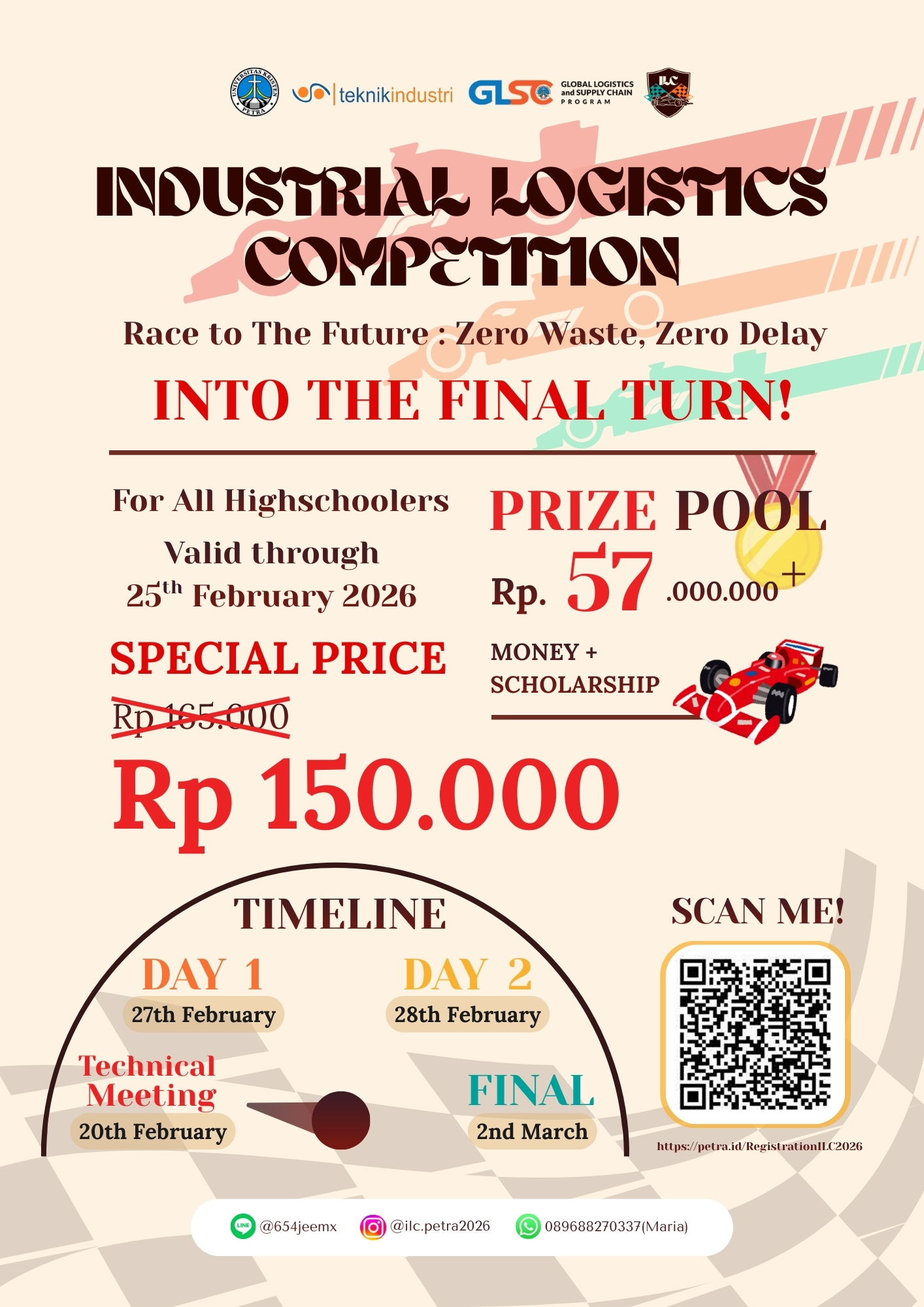 INDUSTRIAL LOGISTICS COMPETITION 2026 Race To The Future : Zero Waste, Zero Delay Hello Highschoolers! Siap buat seru-seruan sambil ngerasain gimana rasanya ngambil keputusan seperti para profesional di dunia industri dan logistik? Di_Industrial Logistics Competition_ 2026, kamu dan tim akan bermain game berbasis simulasi industri nyata, mulai dari alur produksi, manajemen logistik, hingga pengambilan keputusan strategis yang biasa dilakukan di dunia industri real! Bukan sekadar lomba, tapi pengalaman langsung merasakan jadi decision maker di dunia industri. Tunggu apa lagi? Segera ajak tim terbaikmu dan buktikan apakah kalian bisa jadi The Next Future Innovators! Hanya tim terbaik yang mampu mencapai garis finish masa depan! Acara ini diselenggarakan pada 27-28 Februari 2026. Di kampus UK Petra